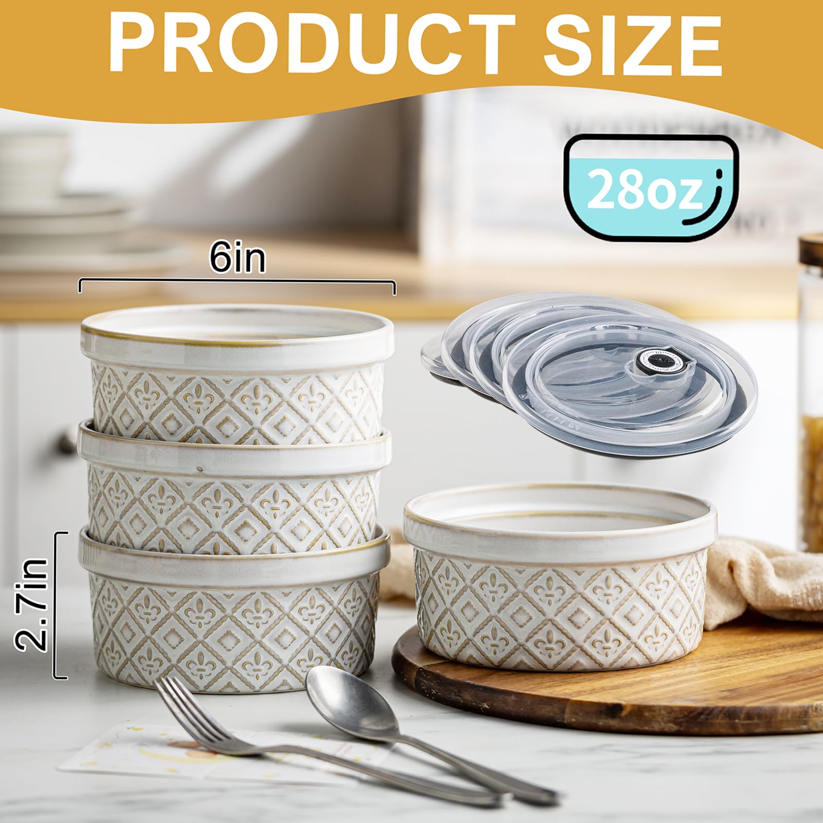 28 Oz Cereal Bowls Set with Lids, Ceramic Salad Bowls for Kitchen, Preparing, Camping, Office Lunch, 6 Inch Porcelain Ramekins Soup Bowls with Airtight Lids set of 4, Housewarming Present, Beige