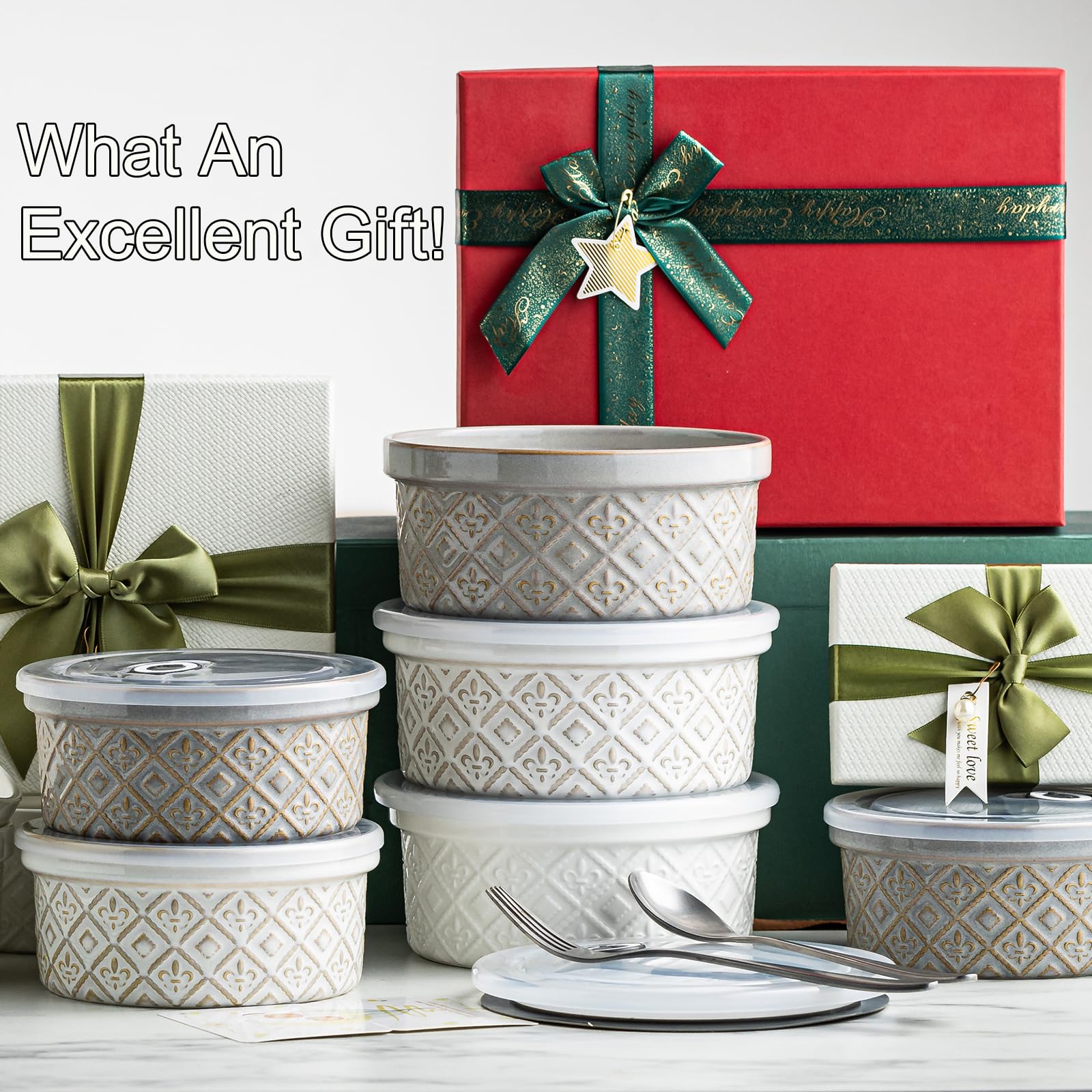 - Elegant Ceramic Design: These versatile ceramic bowls with lids feature beautifully embossed patterns that not only elevate the aesthetic appeal of your kitchen but also ensure long-lasting durability. The elegant design makes them suitable for both cooking and serving, making any meal feel special