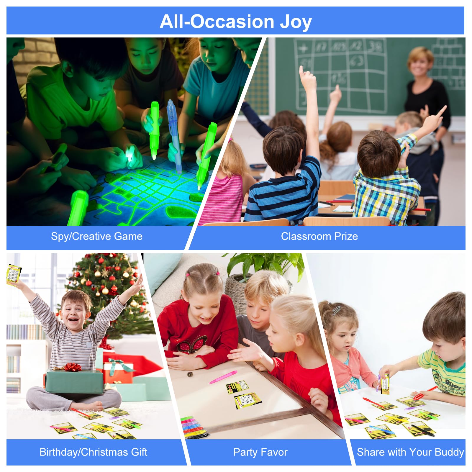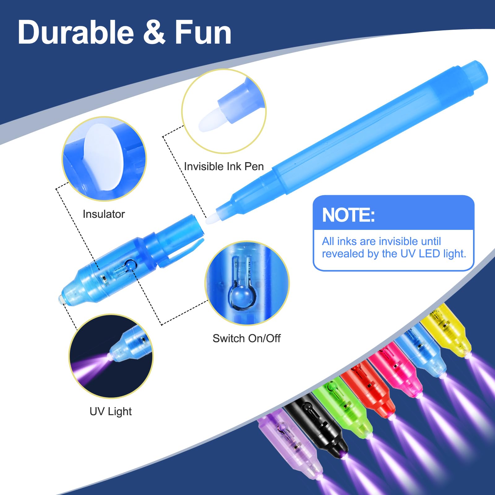 - All-Occasion Gift Set: these invisible ink pen will be a hit at birthday parties, Classroom prize, Halloween treats, or Christmas stocking stuffers, Goodie bag stuffers, these UV pen sets are the go-to for educational and fun party favors. Great for the end of school year gift for the whole class