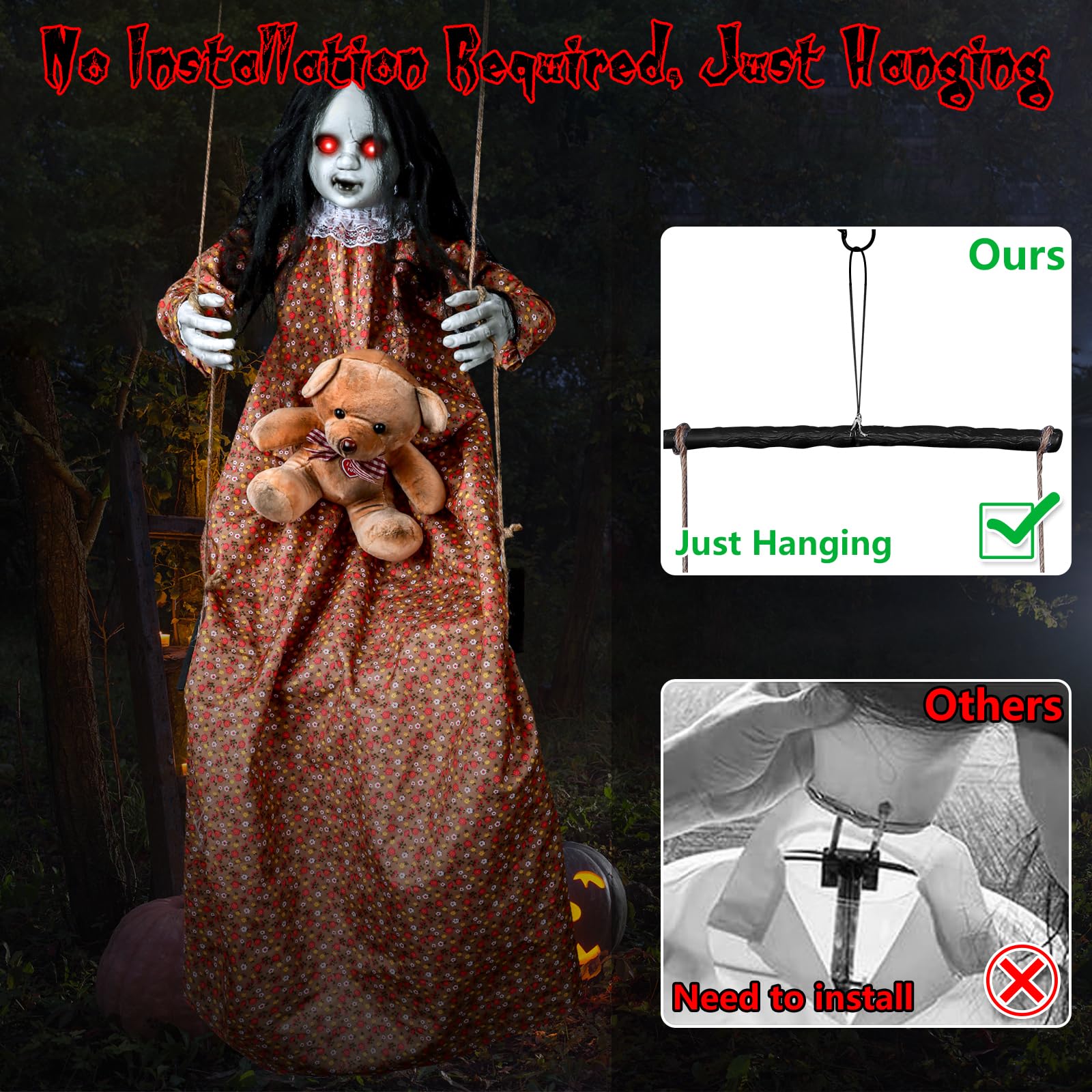 - 【Halloween Horror Doll】: Our Halloween swinging girl with light up eyes and scary sounds, whether indoors or outdoors, can be perfectly spooky and unsettling, adding a tense and scary atmosphere to your Halloween night.