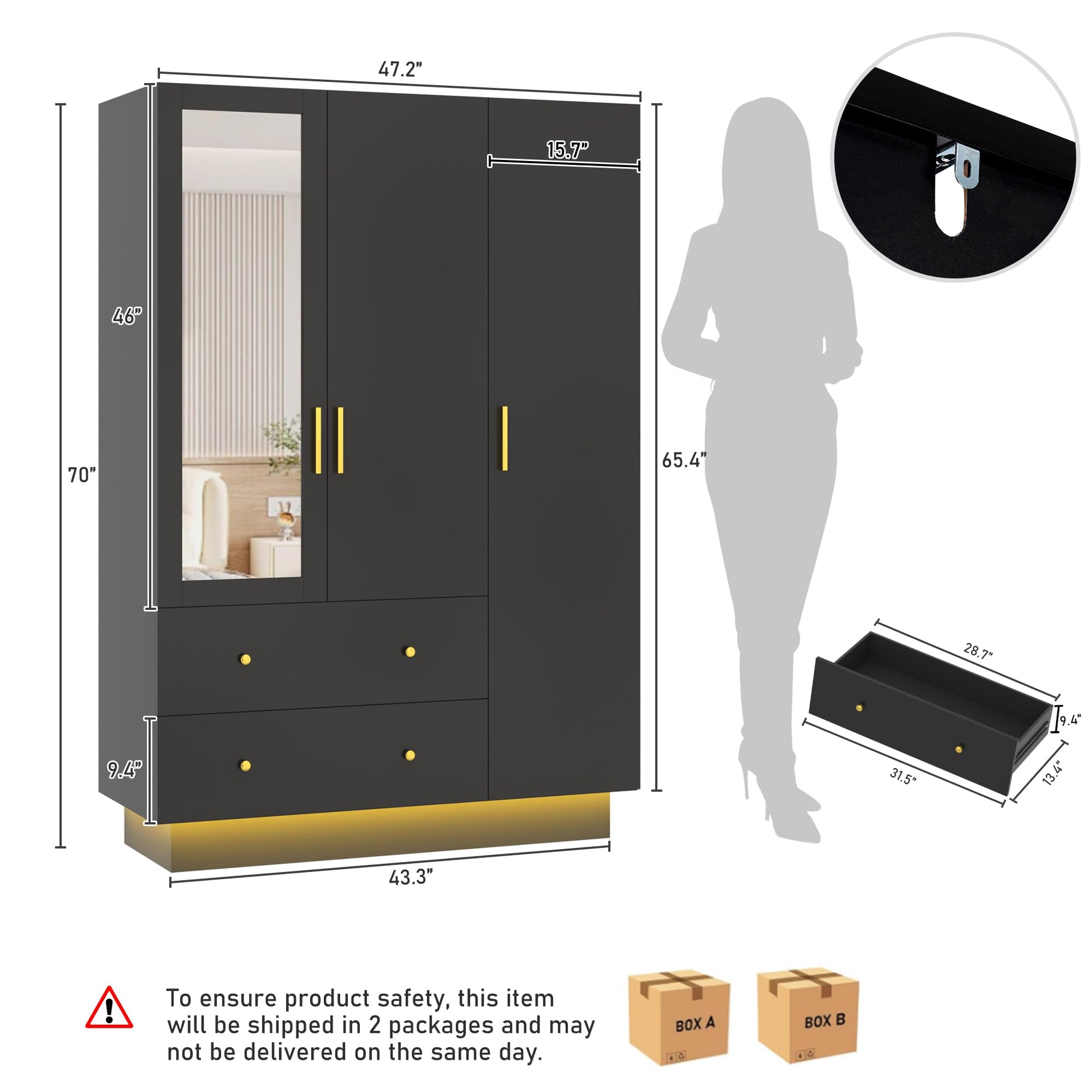 - Buy with confidence: We always put customers first. We ship in 2 packages, so they may not arrive at the same time. Please be patient.Overall dimensions: 19.7"D x 47.2"W x 70.1"H
