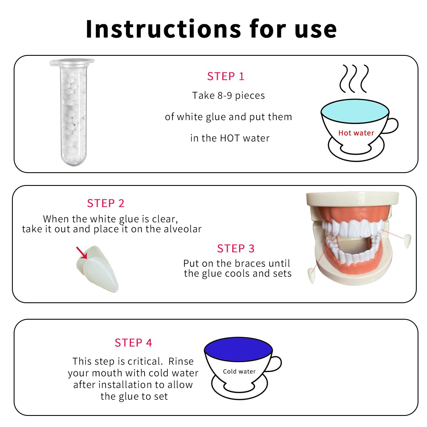 - Usage: Use some denture adhesive to stick the dentures. You can also use sticky gum to secure it. (including adhesive)