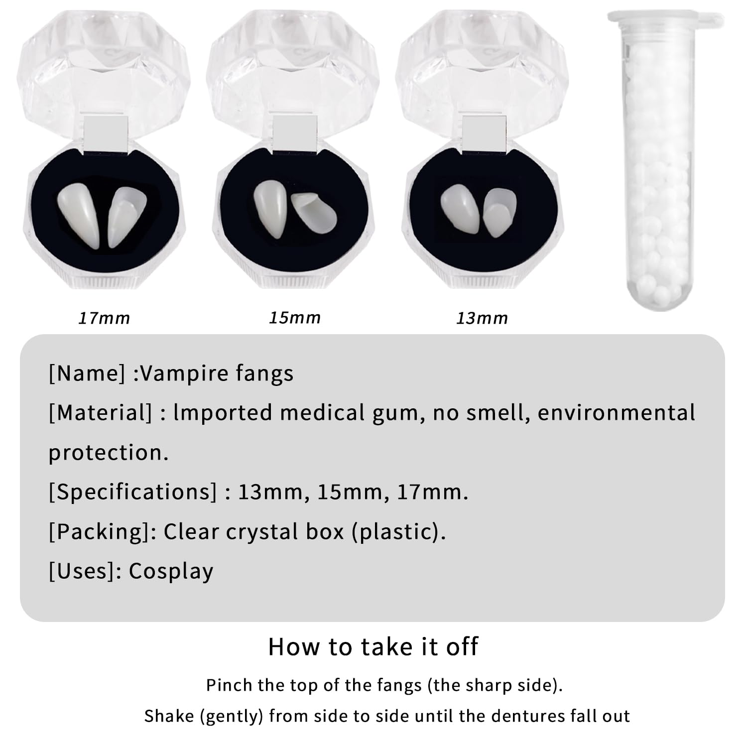 - The set includes three sizes of vampire teeth -13mm, 15mm, and 17mm - you can choose to use the desired size. Embrace the spirit of Halloween with our charming vampire tooth set - a truly unforgettable must-have!