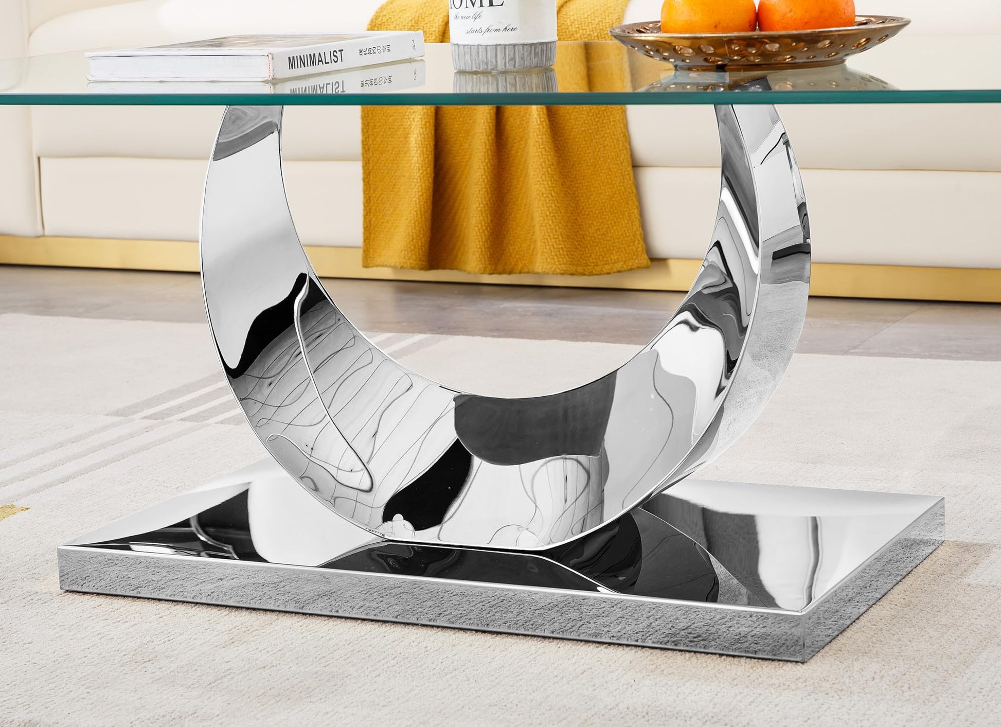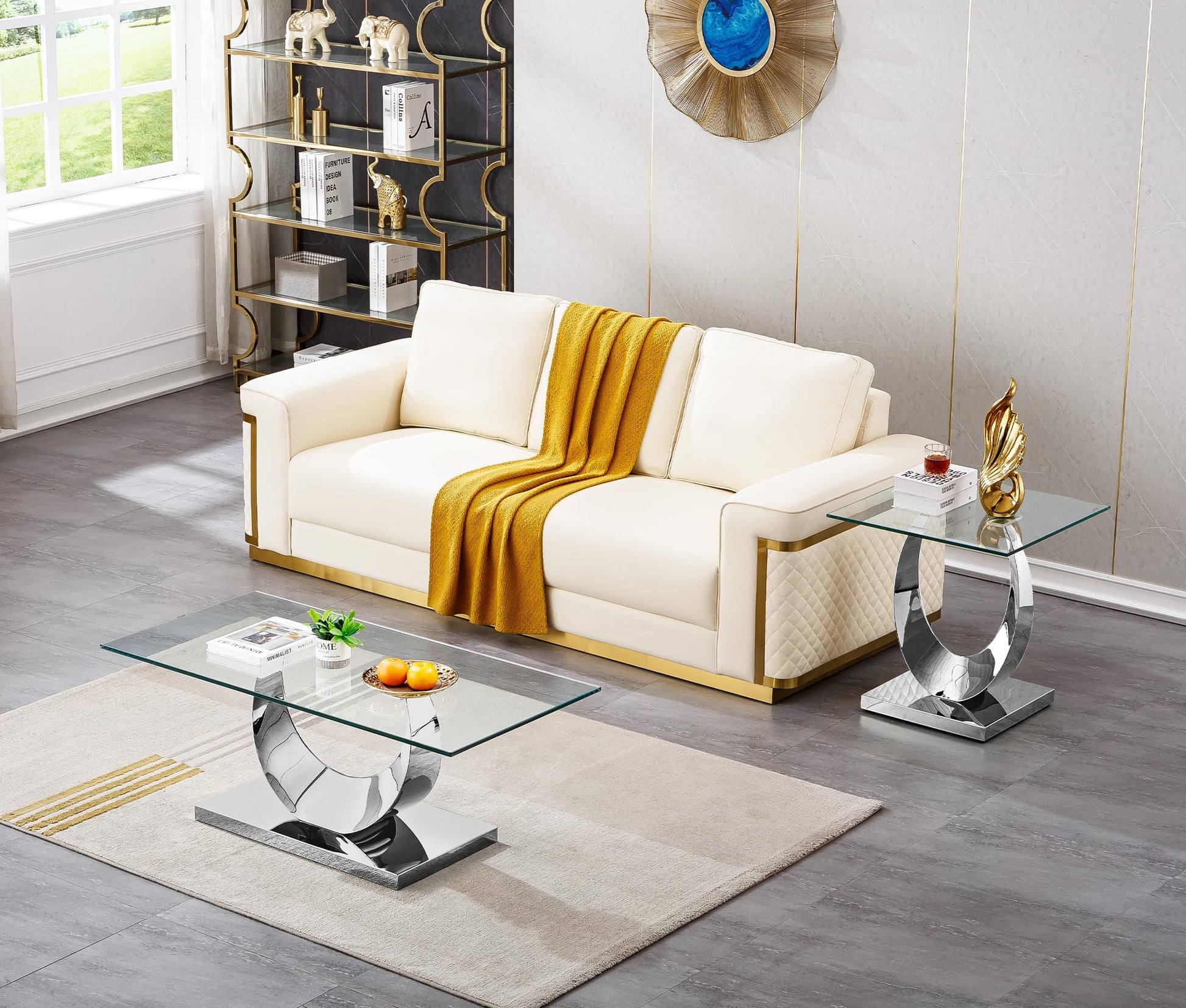 - Coffee table set features tempered glass tabletop and unique mirrored stainless steel legs, it is durable and stylish.