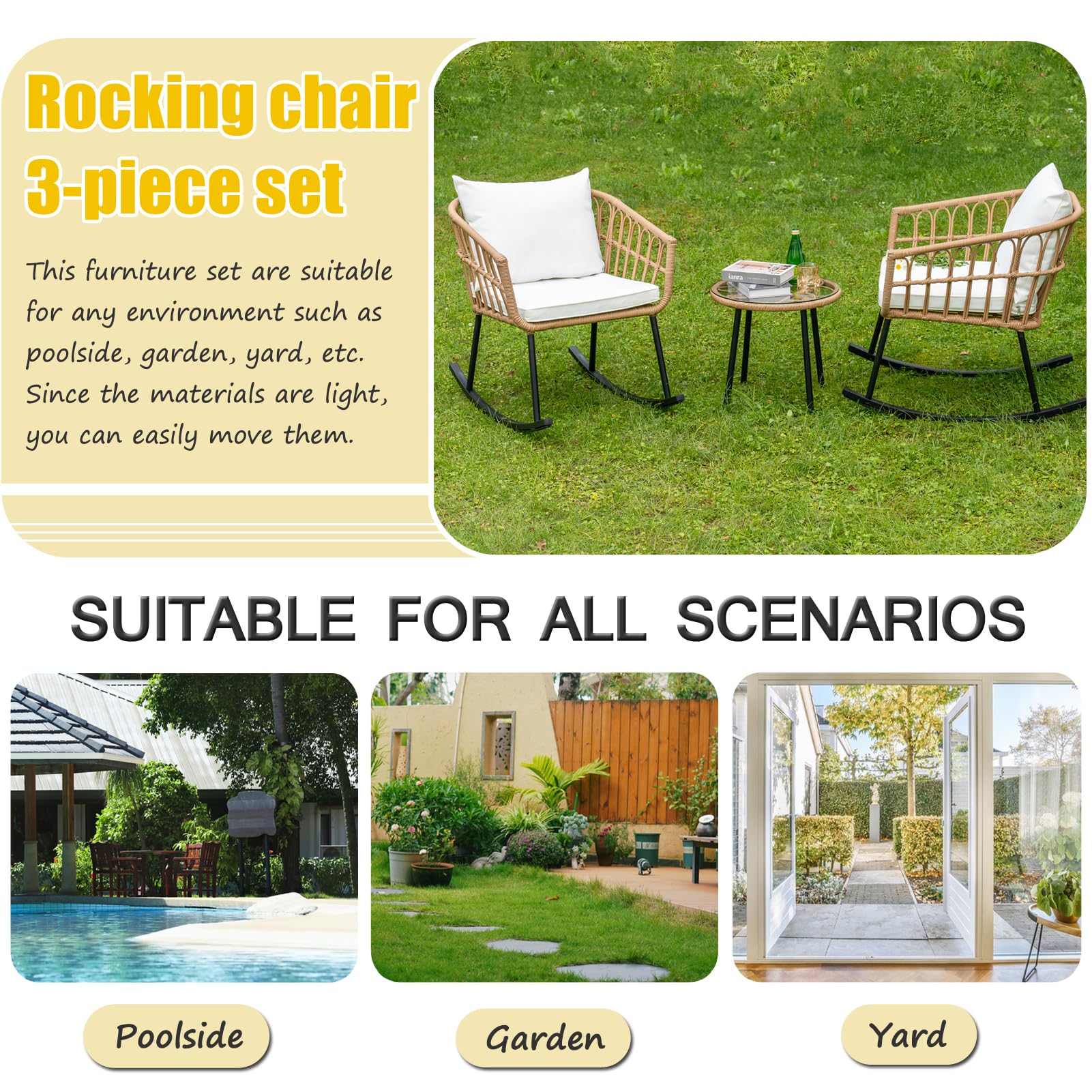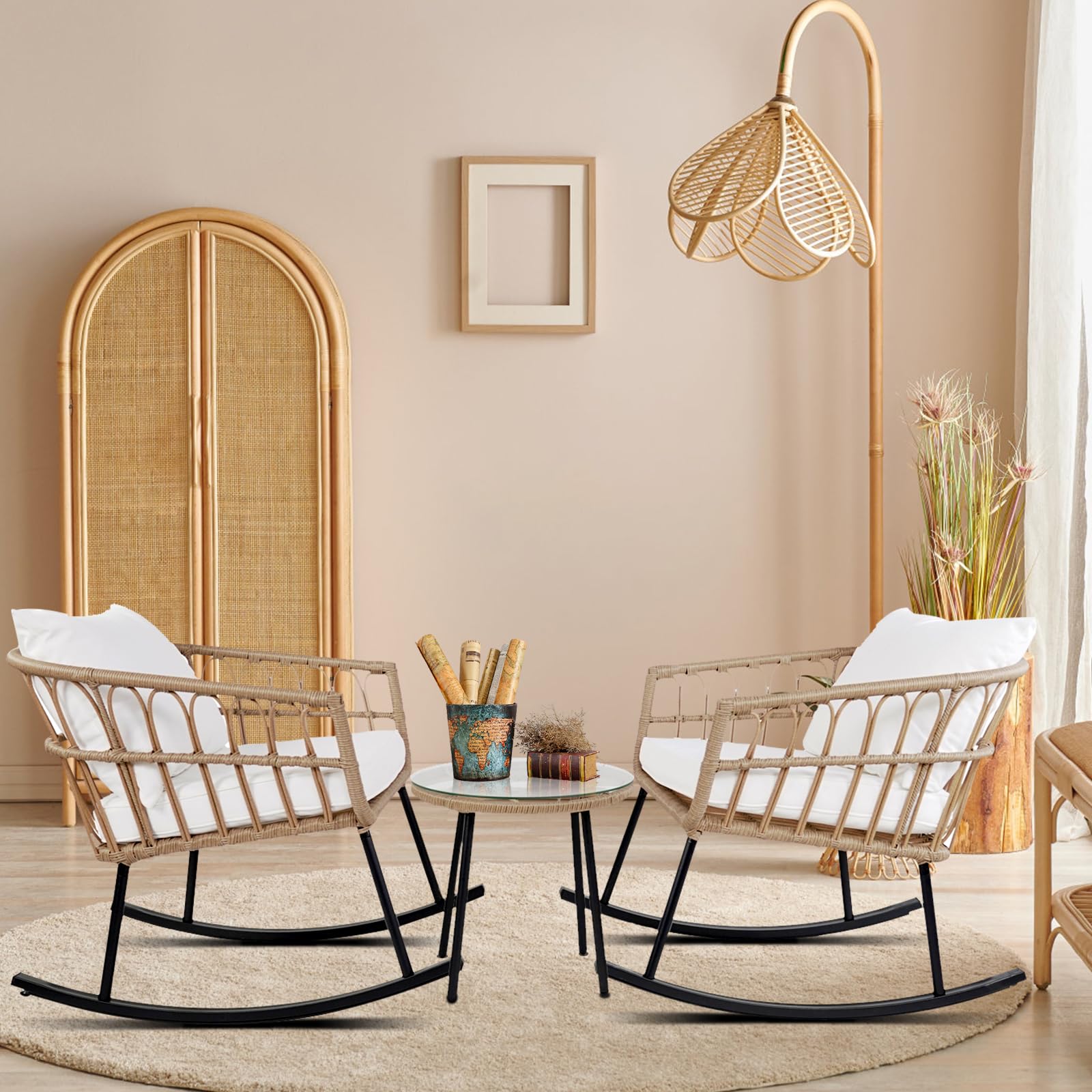 3 Pieces Rocking Chairs Set, Boho Indoor Outdoor All Weather Woven Rope Table Set, Tan Wicker Chat Set with White Cushions, Rattan Sets for Balcony, Garden, Front Porch,Indoor,Living Rooms