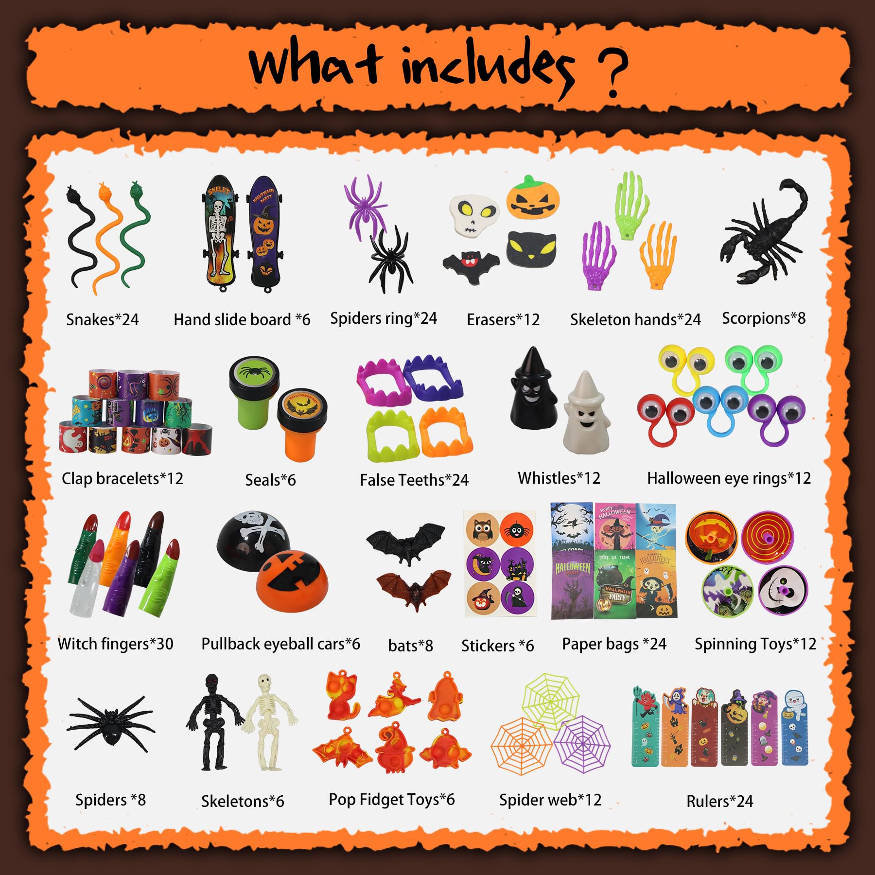 - [Halloween Party Favors Bulk] This Fidget Toys Set (21 Types) features various Halloween-themed party toys: Skeleton, Stampers, Slap Bracelets, False Teeth, Witch Fingers, Spider Rings, Fake Spiders, Pull-Back Cars. Abundant elements of halloween toys allow kids to enjoy more fun. Get ready to surprise the kids. Best Halloween party gift for kids.
