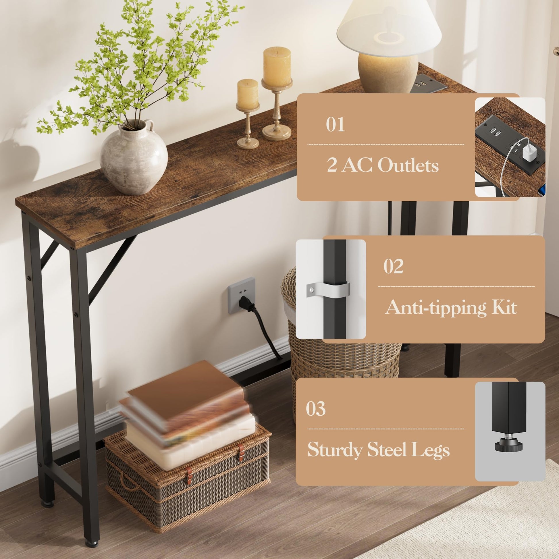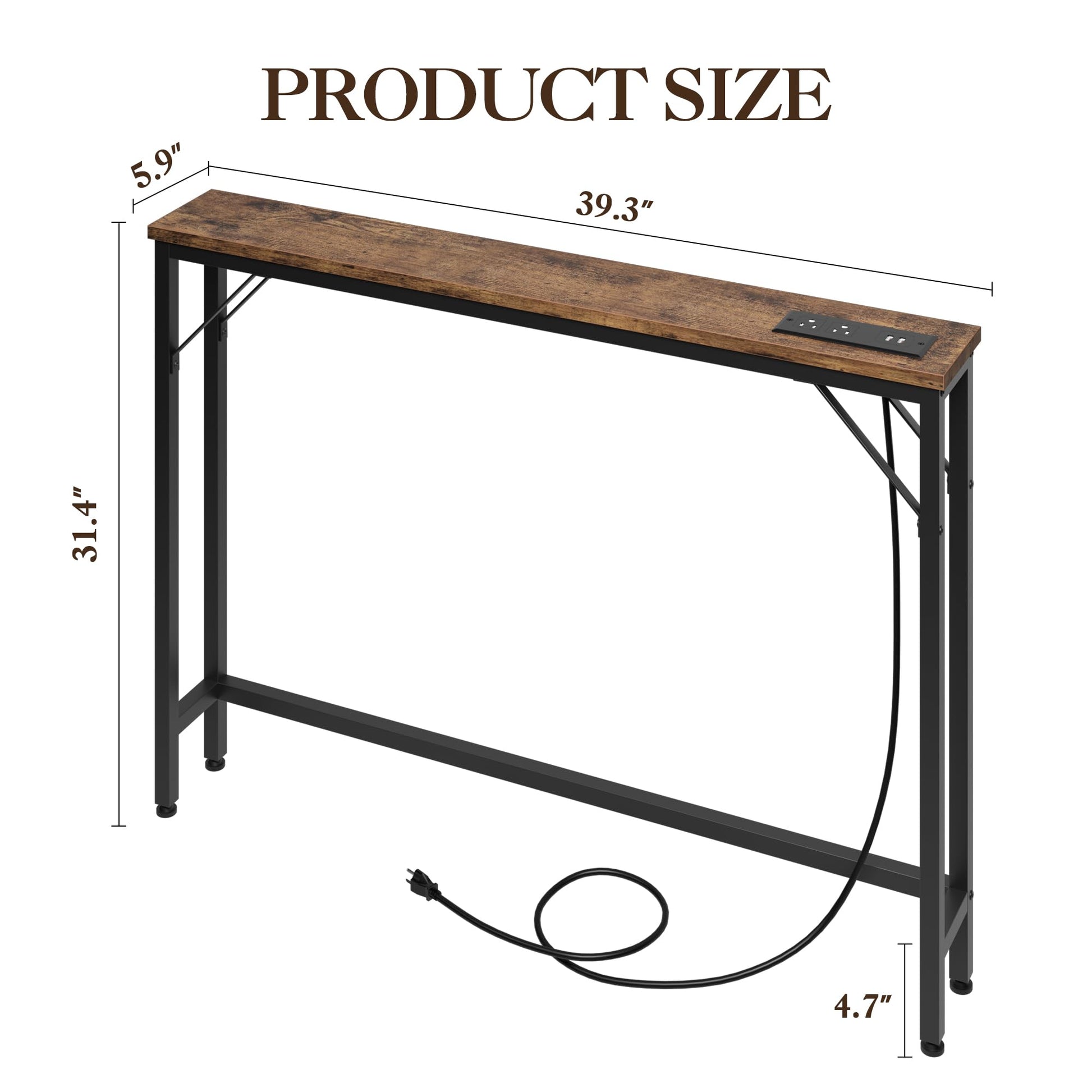 31.4"H Narrow Single-Layer Sofa Back Table with Power Supply, Pure Retro Color - Metal & Particleboard Frame, 2 Power Outlets & 2 USB Ports, Black Sand Powder-Coated Main Frame, Console Sofa Table