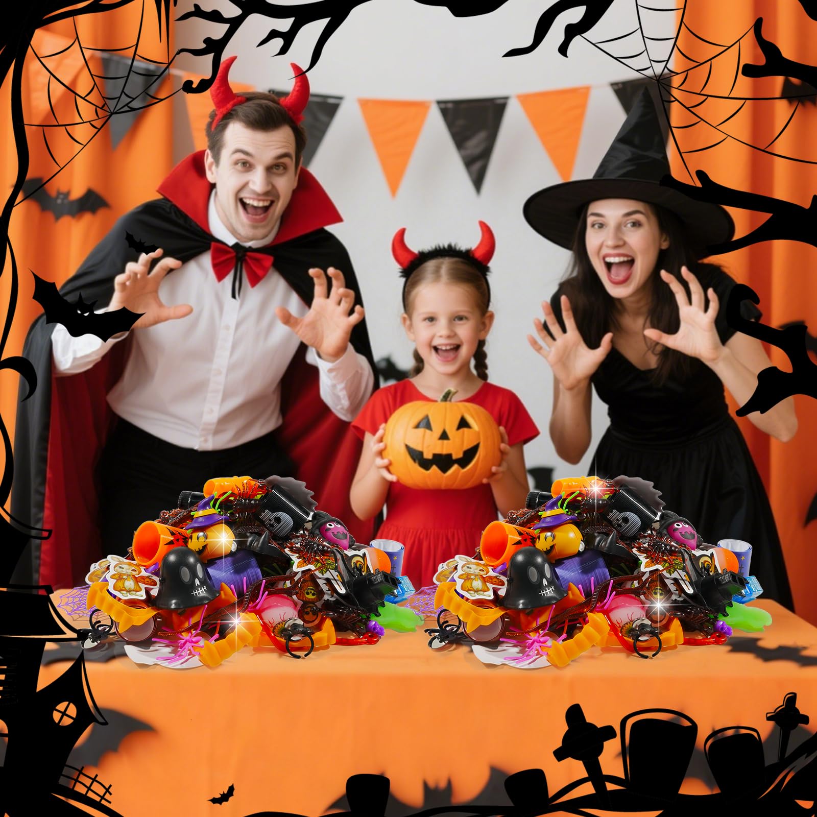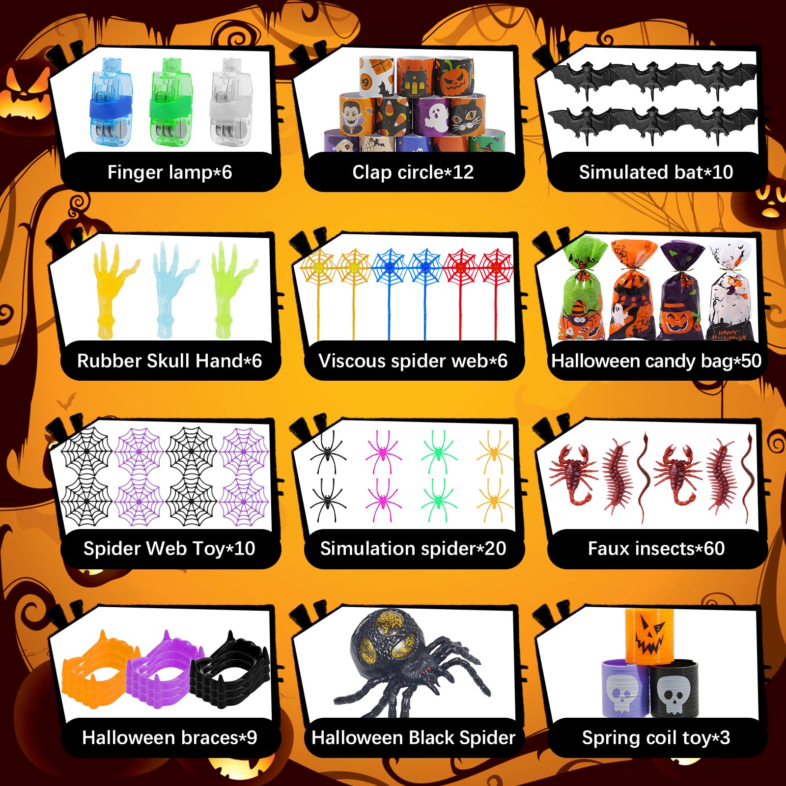 - Memorable Gifts. This Halloween goodie bag fillers contains many Halloween elements such as bats, demons, spider webs, ghosts, centipedes, scorpions, skulls etc, perfectly matching the theme of Halloween parties. It is good for celebrating Halloween and fully experiencing of Halloween.