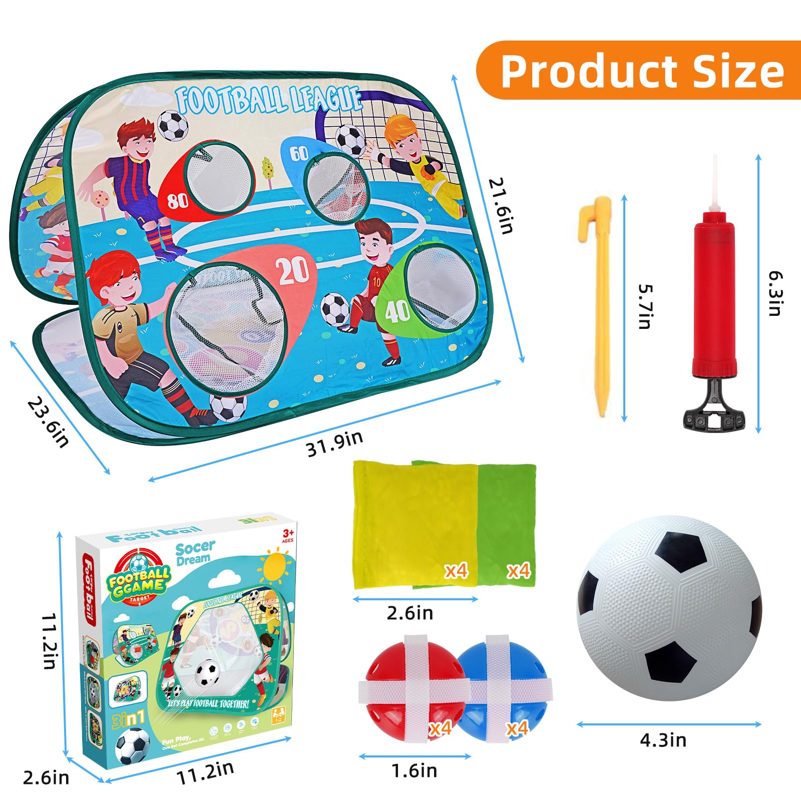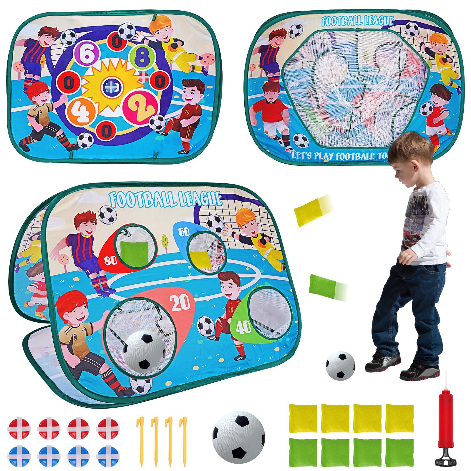 - 3 in 1 Kids Outdoor Toys: outdoor toys for kids ages 3-5 Set includes 1 soccer ball, 8 bean bags, 8 sticky balls and 4 ground pegs. Soccer goal board, hole board and dart board 3 in 1 backyard games, Perfect bean bag toys for 3 4 5 + 5-7 year old boys girls. Birthday present for 3+ year olds boys.