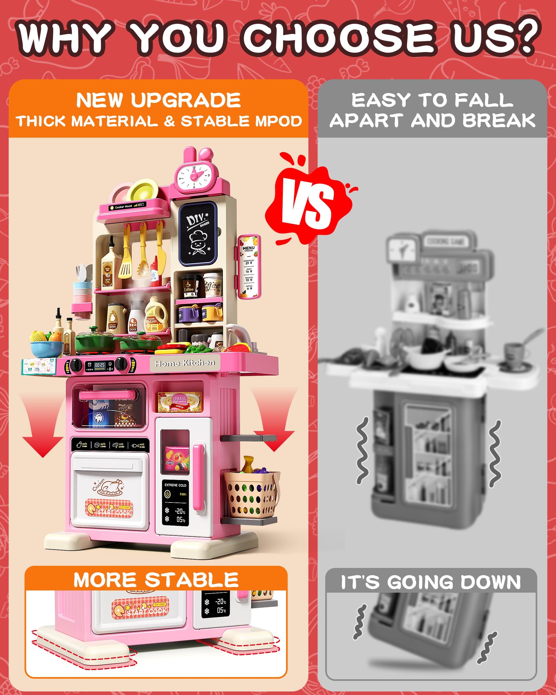 - 【Immersive Kitchen Play Experience】Dive into the world of cooking with this fantastic interactive toy kitchen set! Featuring a glowing electric stove, realistic cooking sounds, a running water sink, various toy foods, and kitchen accessories. Stay organized with ample storage including a refrigerator, oven and shelf.