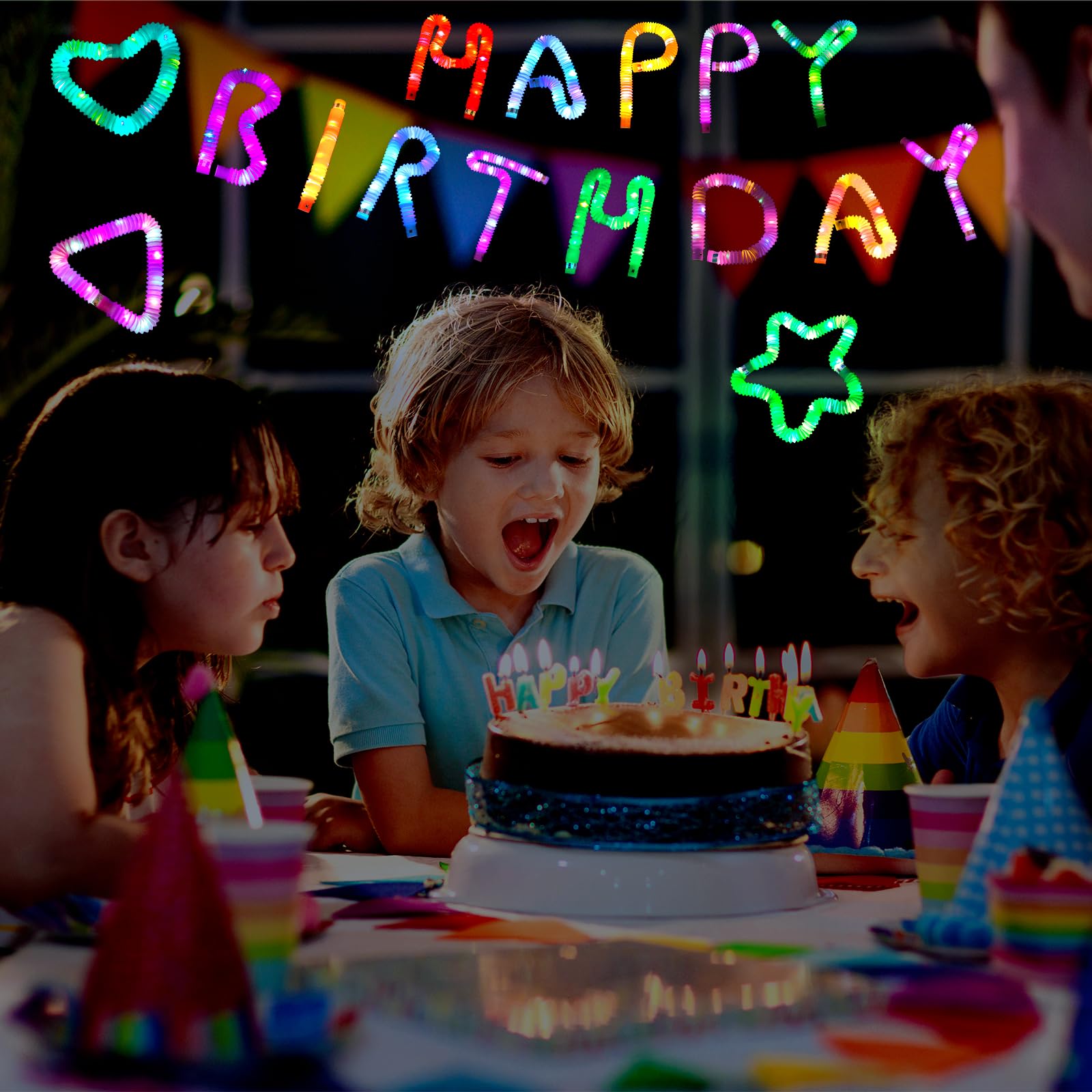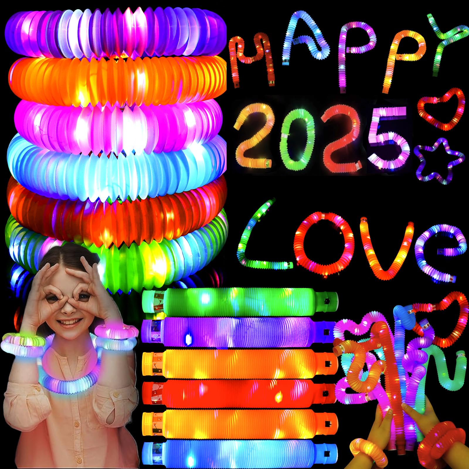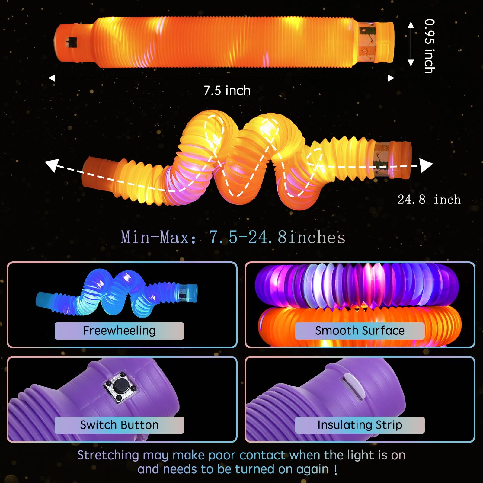 - 【LED Light & Stretch】When you remove the insulating strip and press the switch button, the pop tubes will emits bright light and lasts for a long time.also, you can change the 3 LED light modes.Stimulate your adult's imagination to Create alphabet letters, numbers, any other shapes and make up games for hours of entertainment.