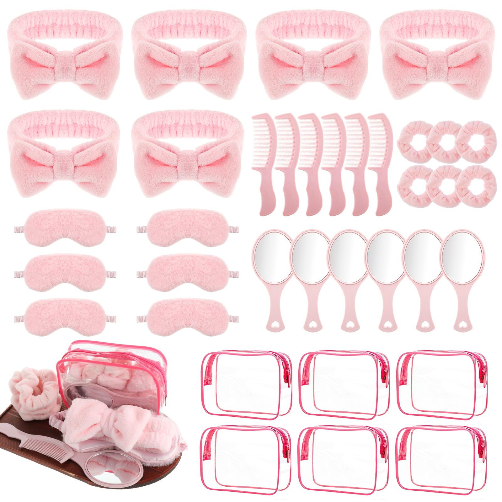 - Complete Sleepover Party Set: This 36-piece sleepover party supplies for girls includes 6 pink spa headbands, 6 pink sleep eye masks, 6 velvet hair scrunchies, 6 organizer bags, 6 mirrors, and 6 combs—everything you need for a full spa experience!