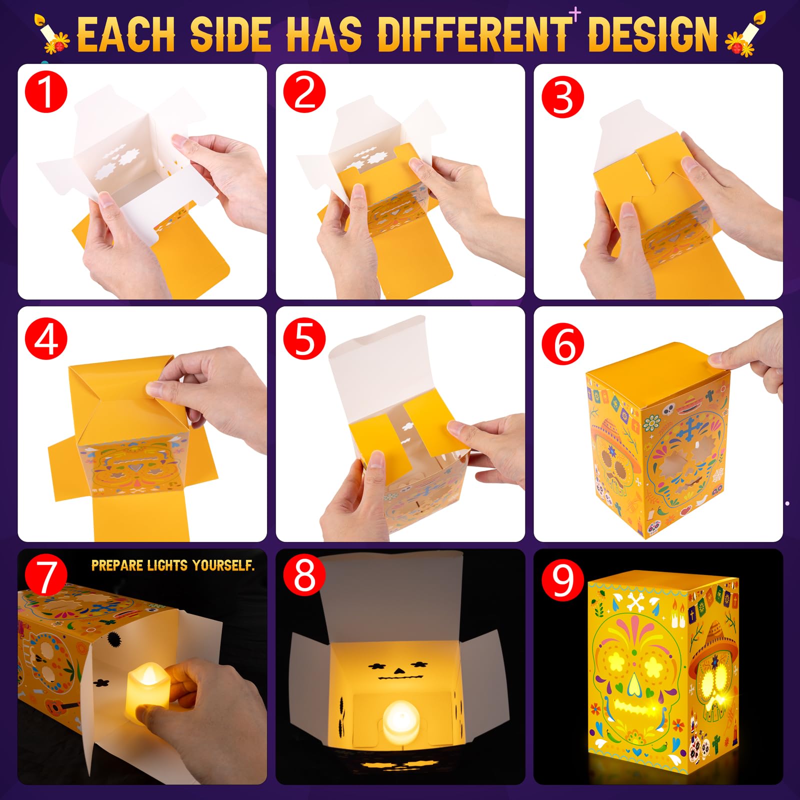 - Day of the Dead Party Set–Includes 36 decorative paper boxes suitable for holding tea lights or LED candles. Great for Día De Los Muertos altars, Halloween, or themed parties.Note:Lights are not included.