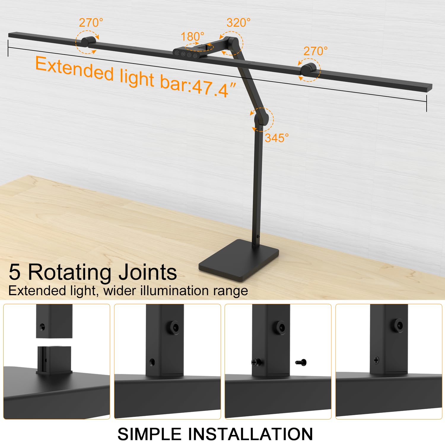 - ULTRA WIDE & ULTRA BRIGHT: This 36W led desk lamp features 47.4inches adjustable three section light bar, ensuring no dark areas while illuminating a larger area. The desk light is equipped with high quality chips, delivering the light 3000LM. An excellent color rendering index (RA>90), Simulating nature light that will accurately reveal their truest colors. Meanwhile, the office lamp provide uniform illumination without flicker creates comfortable working environment that reduces eye fatigue caused by computer screen, it's an essential part of the office.
