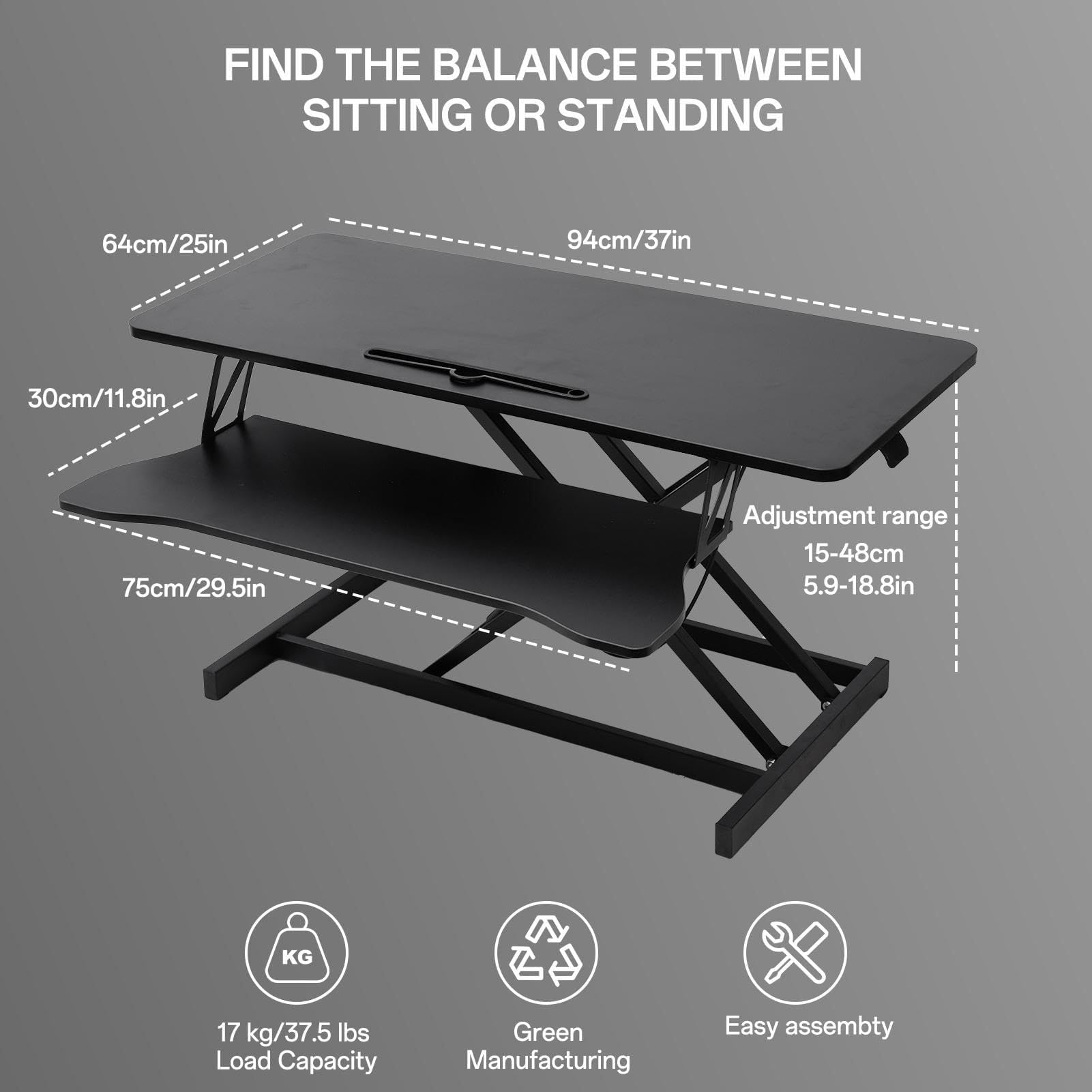 - 【Large Work Area】- At 37" wide, our adjustable standing desk converter has room for your computer or laptop, doublemonitor display, keyboard, speakers, and other home office accessories(94*40cm)