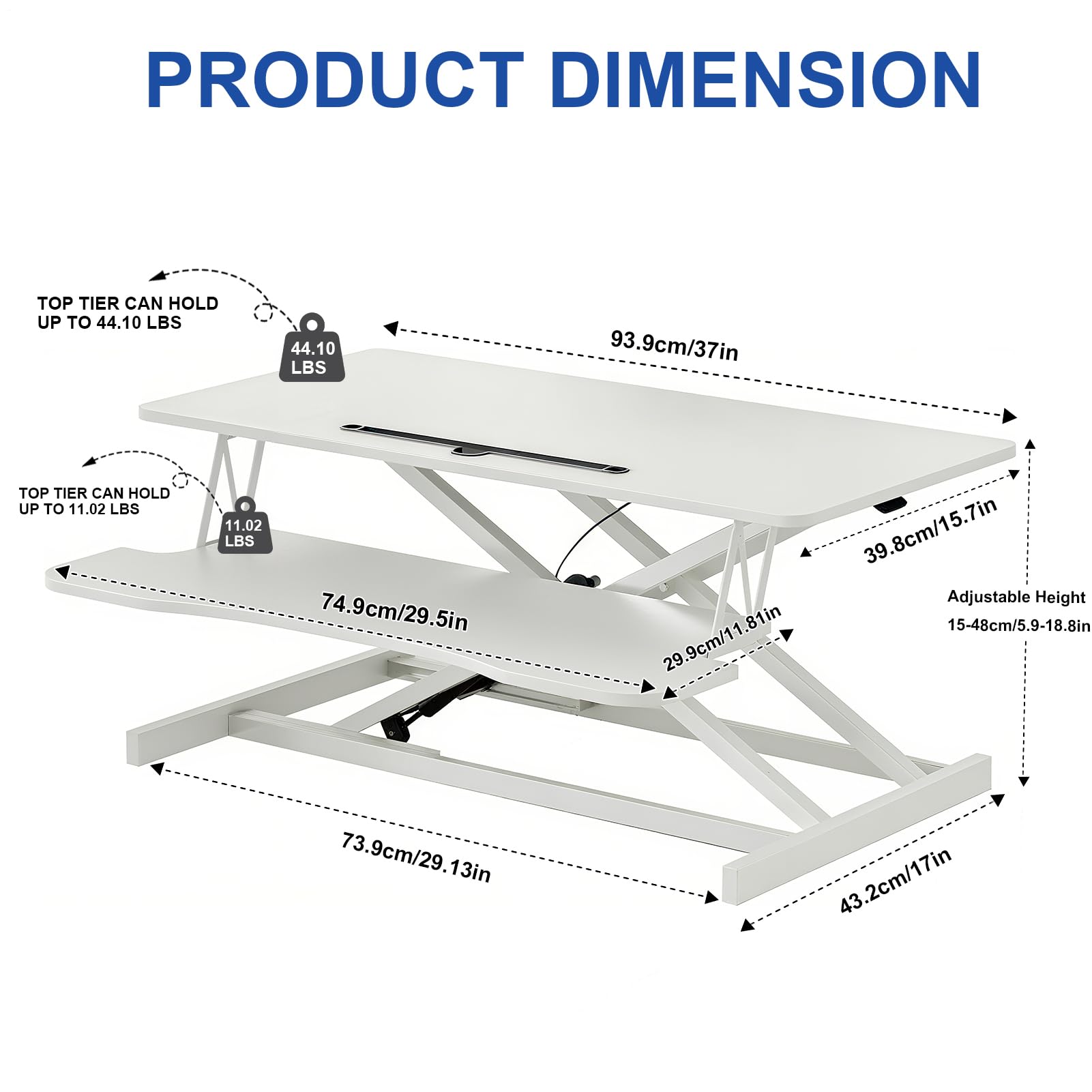 - 【Spacious Workspaces】At 38" wide, our adjustable standing desk converter has room for your computer or laptop, two monitor display, keyboard, mouses, speakers, and other home office accessories. The spacious 94x40cm desktop is constructed from high grade material and is large enough to accommodate 2 monitors and a wide range of office equipment. The double-layer design not only provides extra storage space, but also enhances the overall durability, making your office area more tidy and organized
