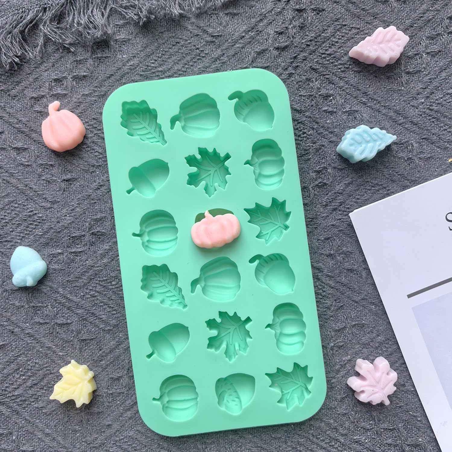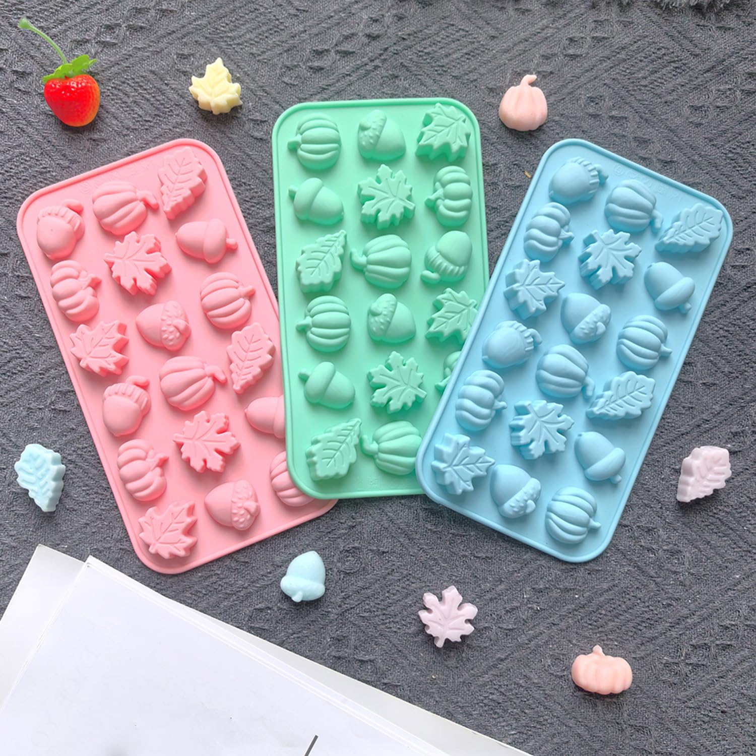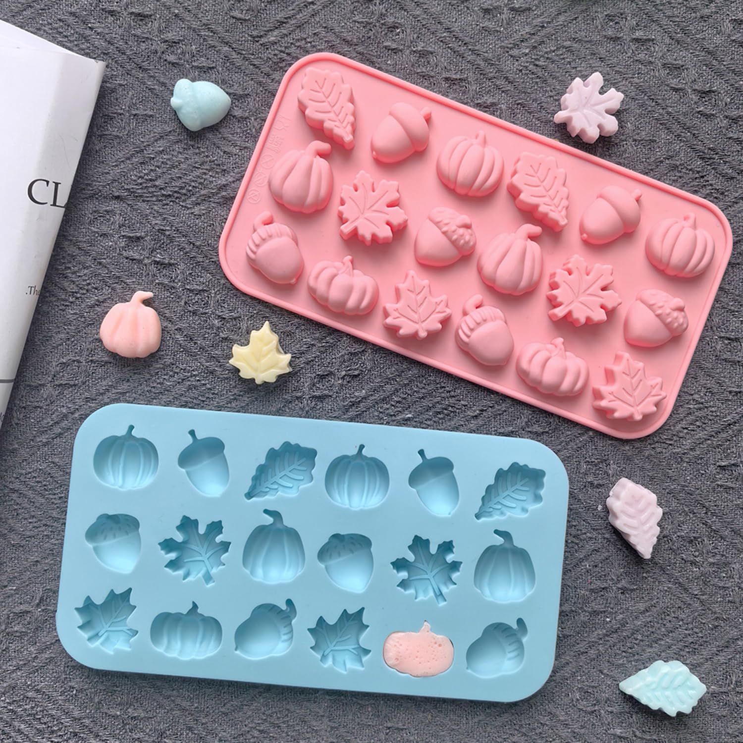 - Silicone Molds: Set of 3pcs silicone candy molds with 18 cavities each, showcasing classic fall designs like Pumpkin,maple leaves,and Chestnuts.
