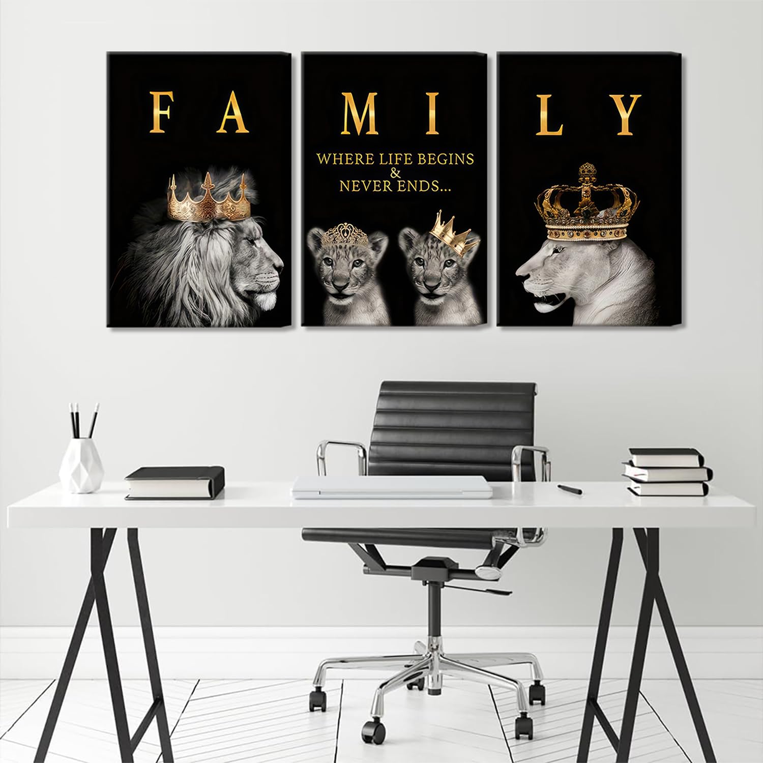 3Pcs Framed Lion Family Canvas Wall Art The Lion King and Queen with Gold Crown Poster Modern Motivational Black and White Animal Wall Decor Painting for Home Bedroom Living Room Office decoration