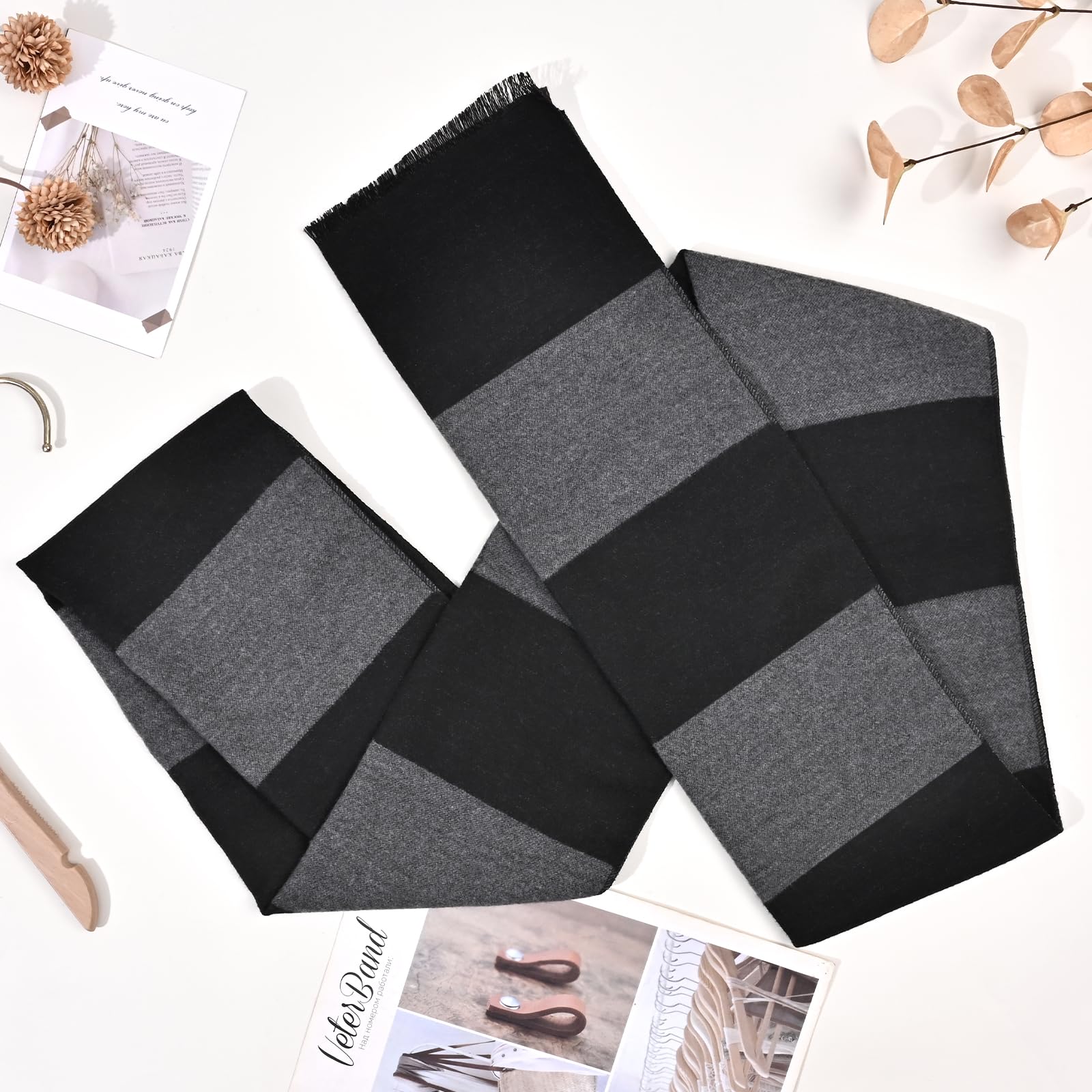 - HIGH QUALITY SCARF:Crafted from premium polyester-acrylic blend, our black and gray striped scarf measures 12x70 inches. Experience exceptional softness, lightweight warmth, and luxurious texture that redefines comfort.