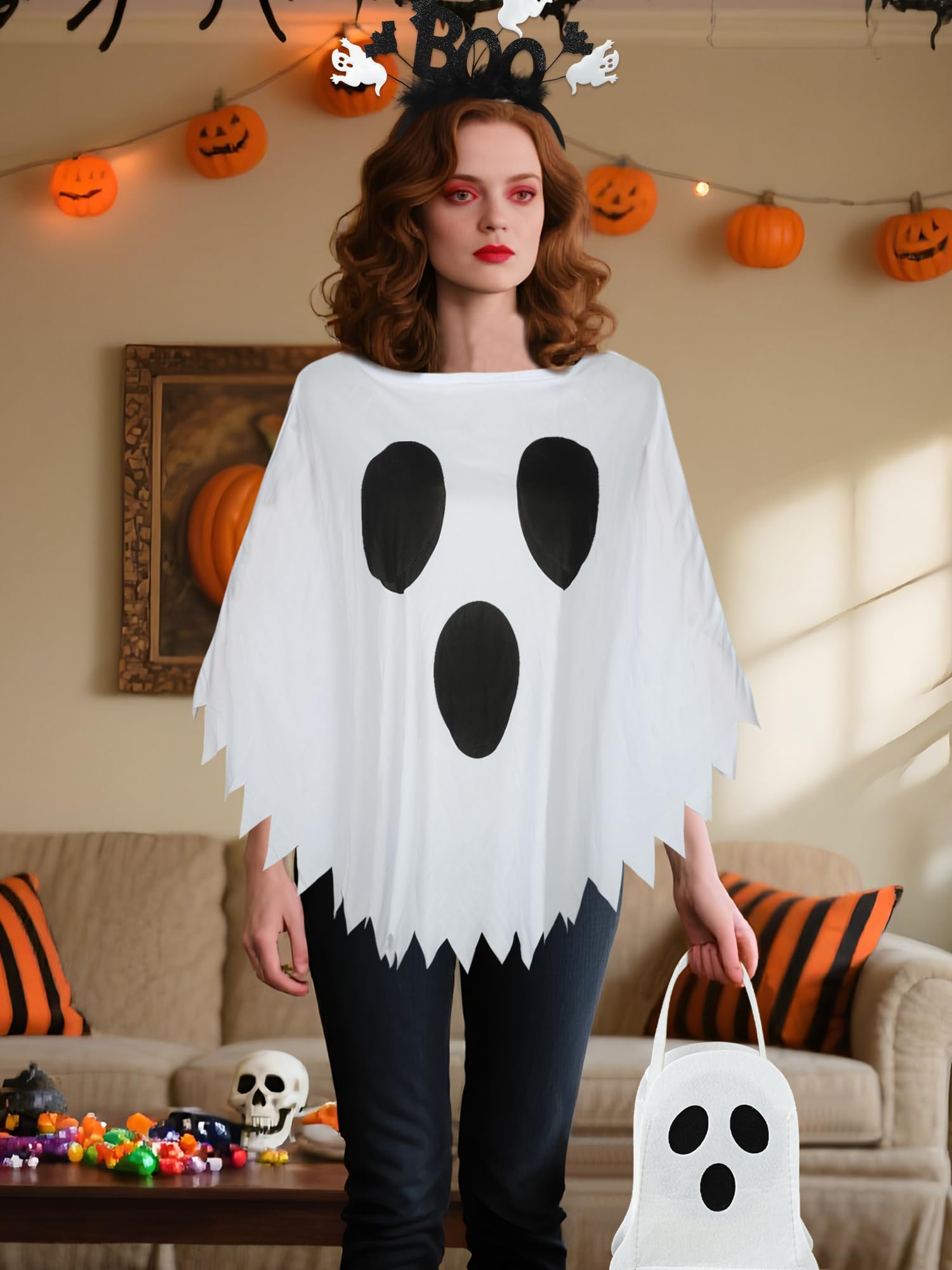 - Novel design:Our Ghost dress poncho cape is themed around ghosts. The ghost design in front of poncho will catch people's eyes. Paired with the Ghost boo headband and the ghost candy bag, it will make you stand out in the crowd!