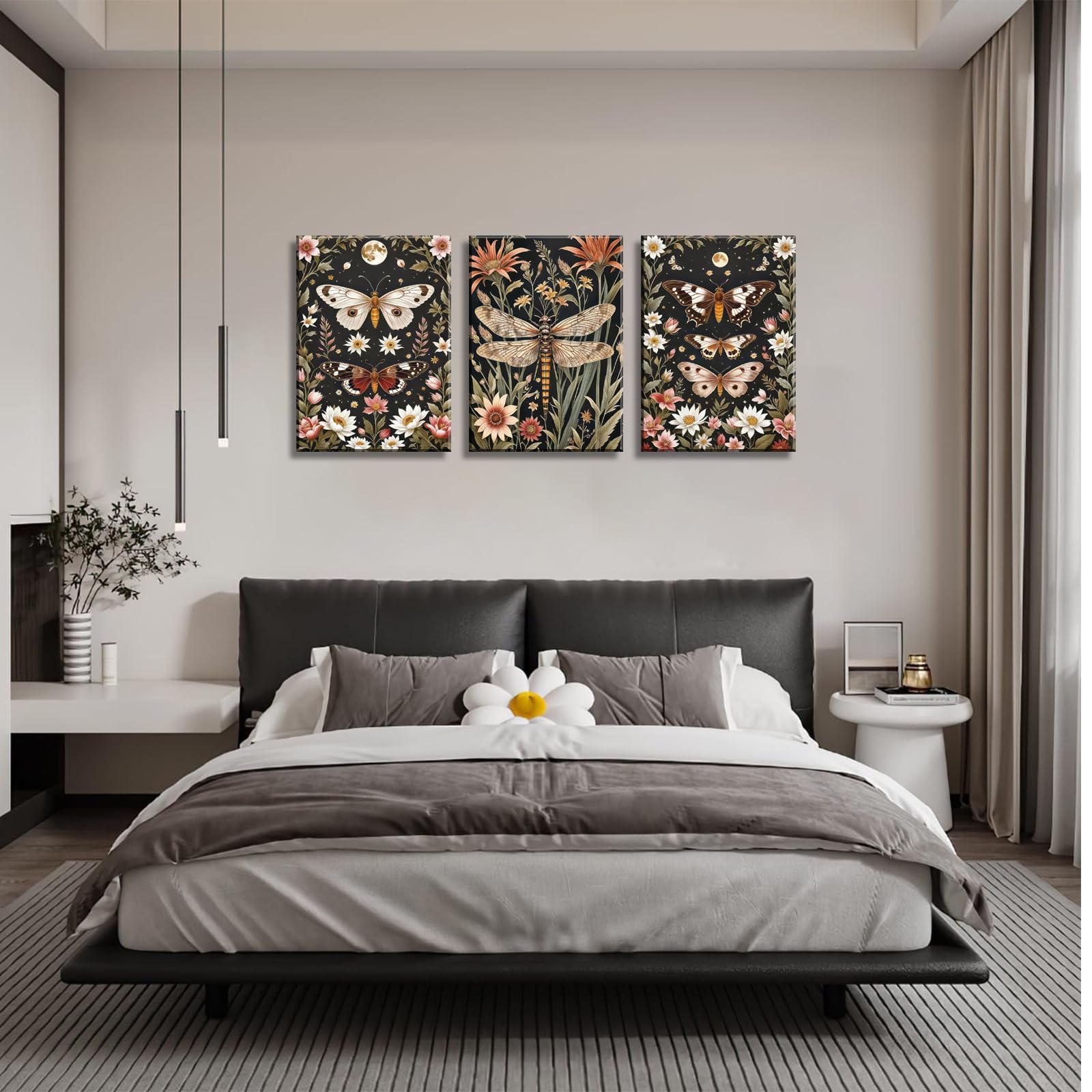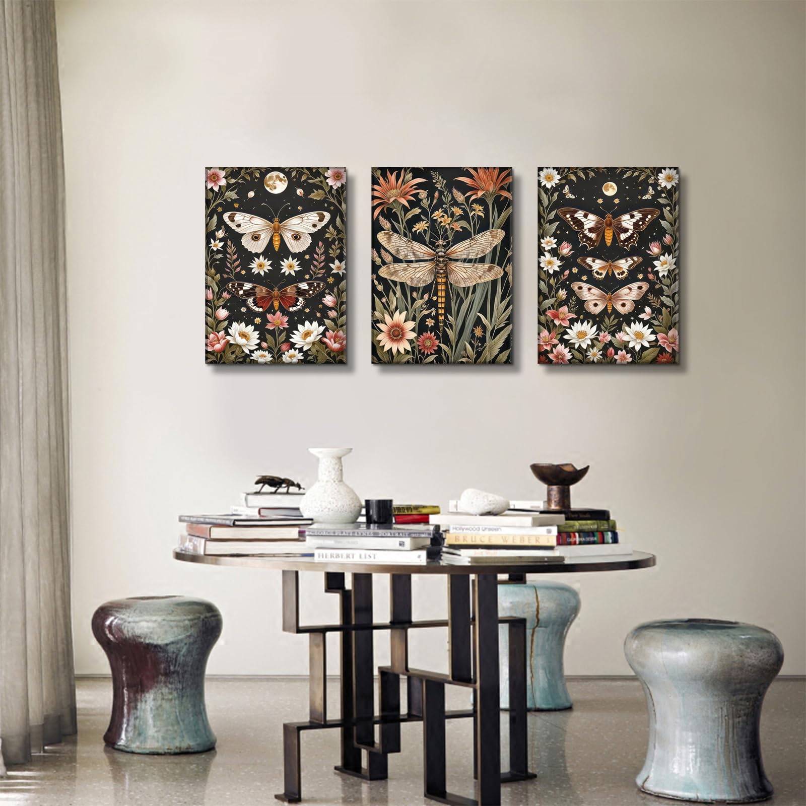 3Pcs Vintage Insect Wall Art Moody Insect Canvas Pictures Butterfly and Dragonfly Prints for Living Room Bedroom Bathroom 12x16in Canvas