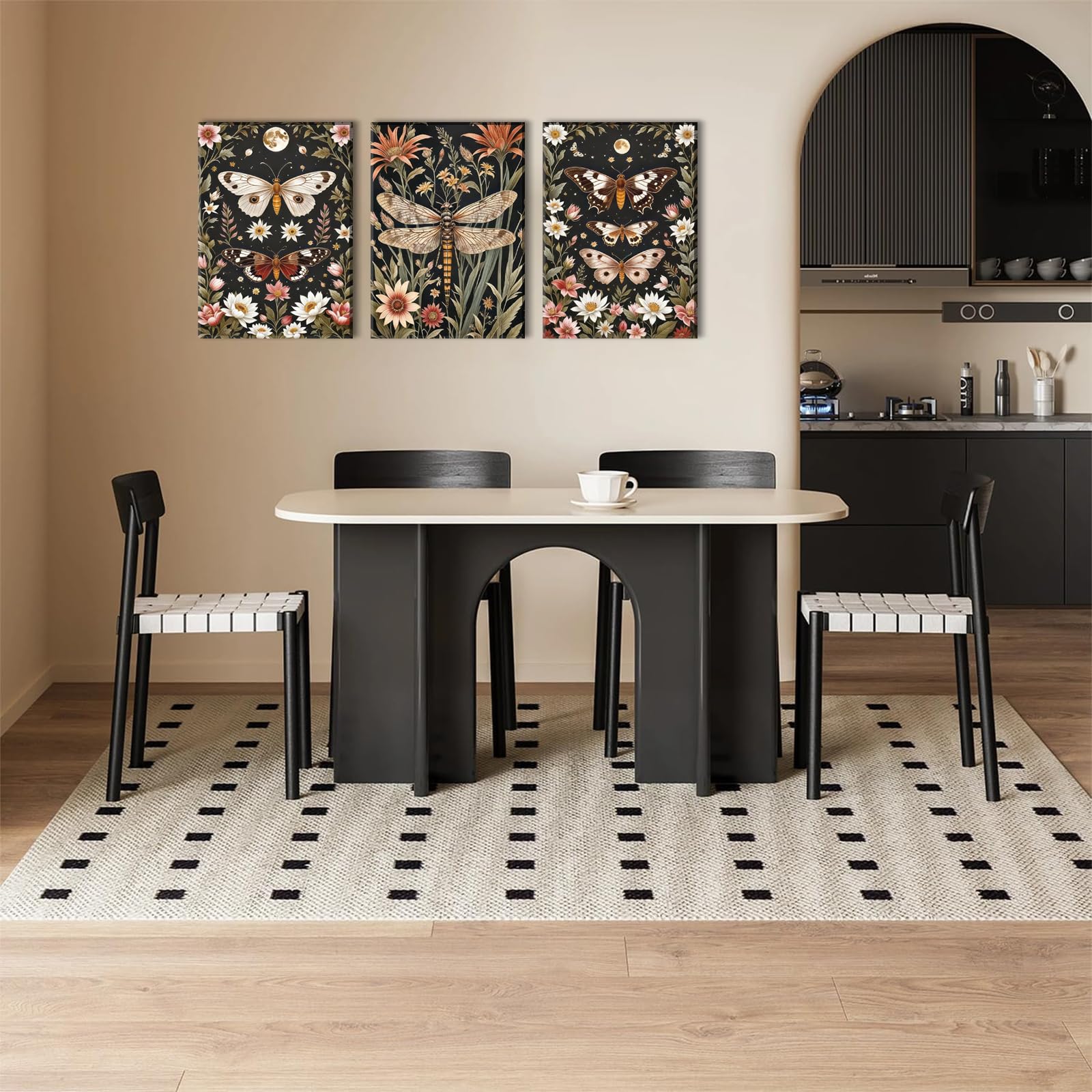- Vintage Natural Plant Wall Decor: This wall art set includes dragonflies butterflies flowers dark background graceful floral patterns vintage aesthetics soft colors black and cream beige tones and bohemian surrealism detailed dark preppy style