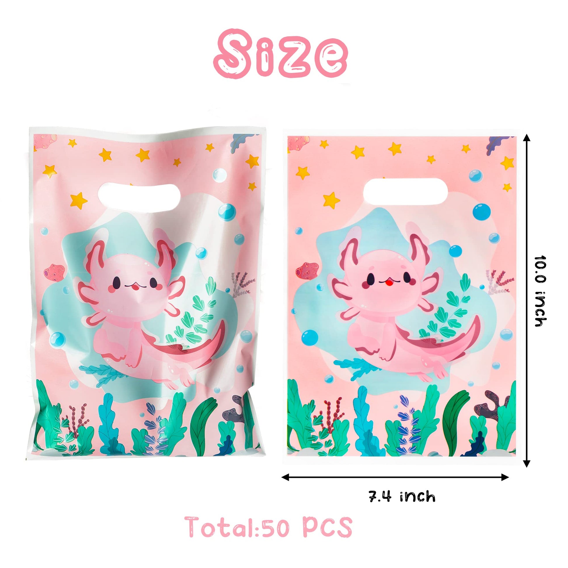 - [Axolotl Theme design] The party bags with axolotl are designed with lovely lake animals, which are eye catching as props decoration, like baby shower, birthday party and etc. 50pcs axolotl themed gift bags are included. All of them are wrapped in one plastic bag to make sure won’t get ruined.