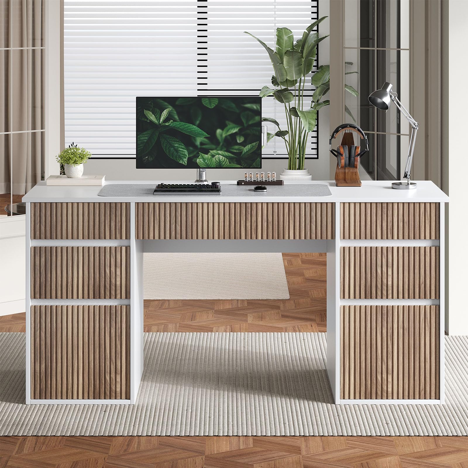 4 EVER WINNER 58 Inch White Desk with Drawers, Home Office Desks with 7 Storage Drawers, Executive Desk with File Cabinet for Bedroom Study Work Table Writing, White and Walnut