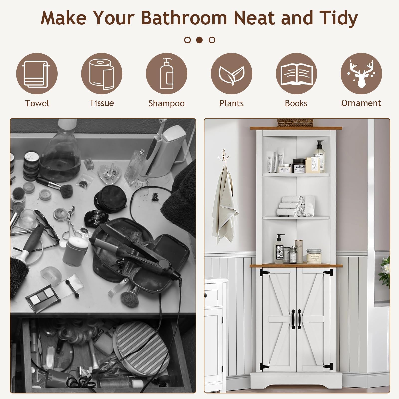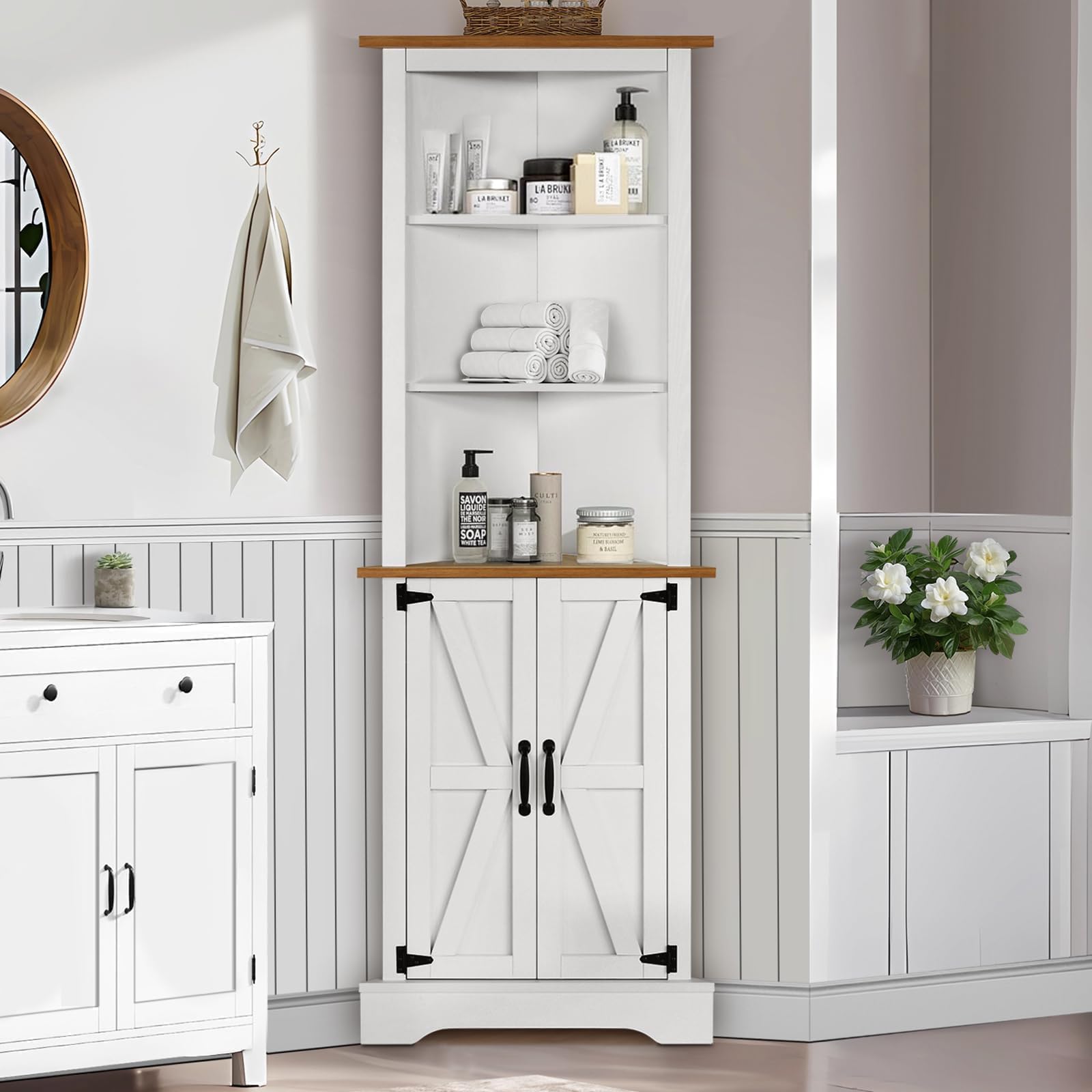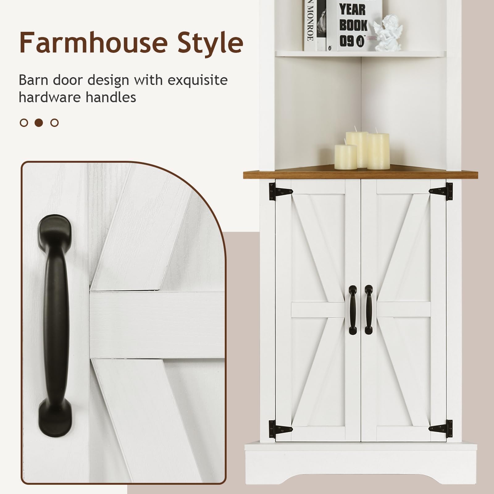 4 EVER WINNER Tall Corner Cabinet with Barn Door and Adjustable Shelves, 5-Tier Corner Shelves for Small Space, Living Room, Hallway, Bathroom, White