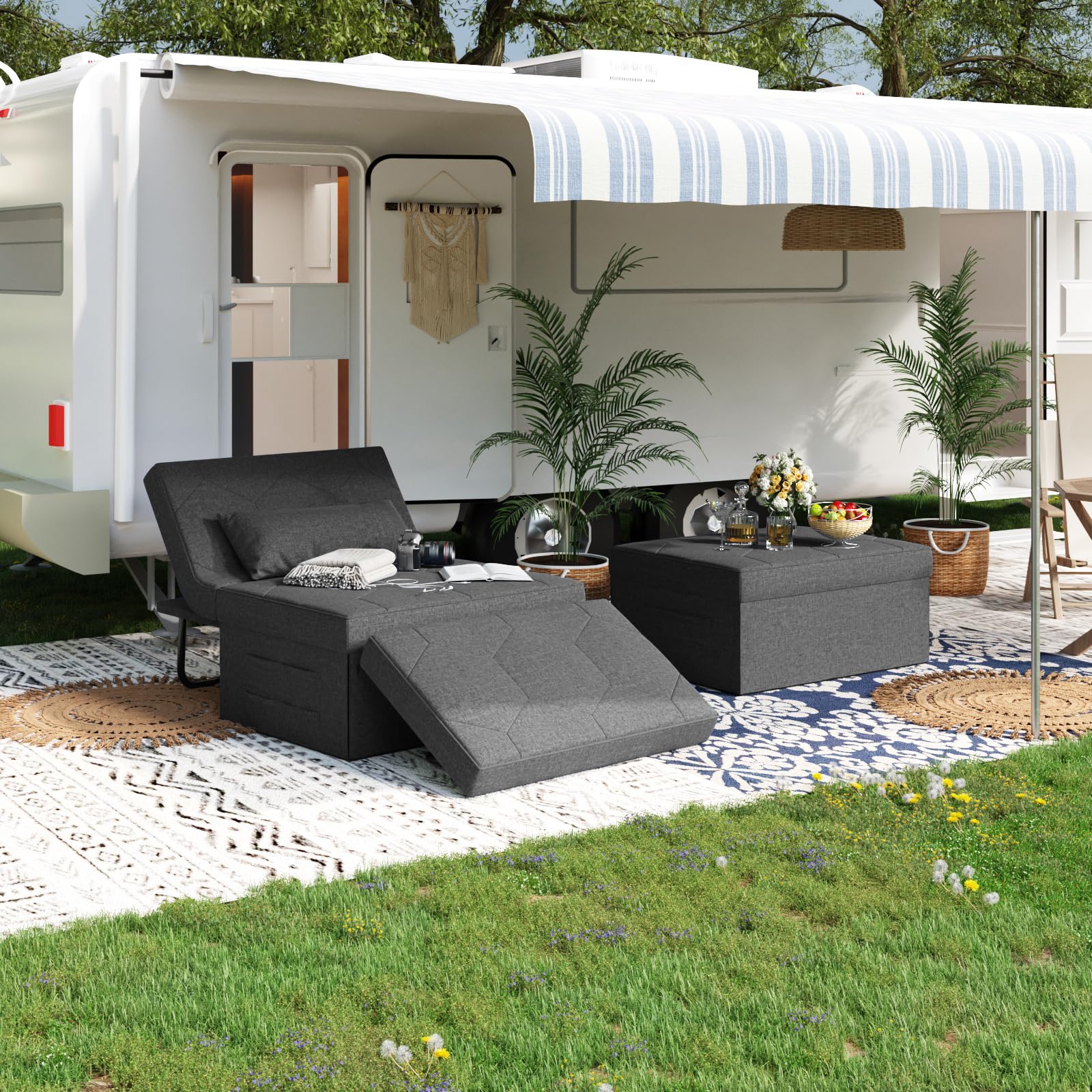 - Versatility and Portability. This chair that turns into a bed shrinks to a 27 inch wide ottoman form, suit for small spaces, and ideal for RV, travel trailers, living room, bedroom, apartment, balcony, and office furniture