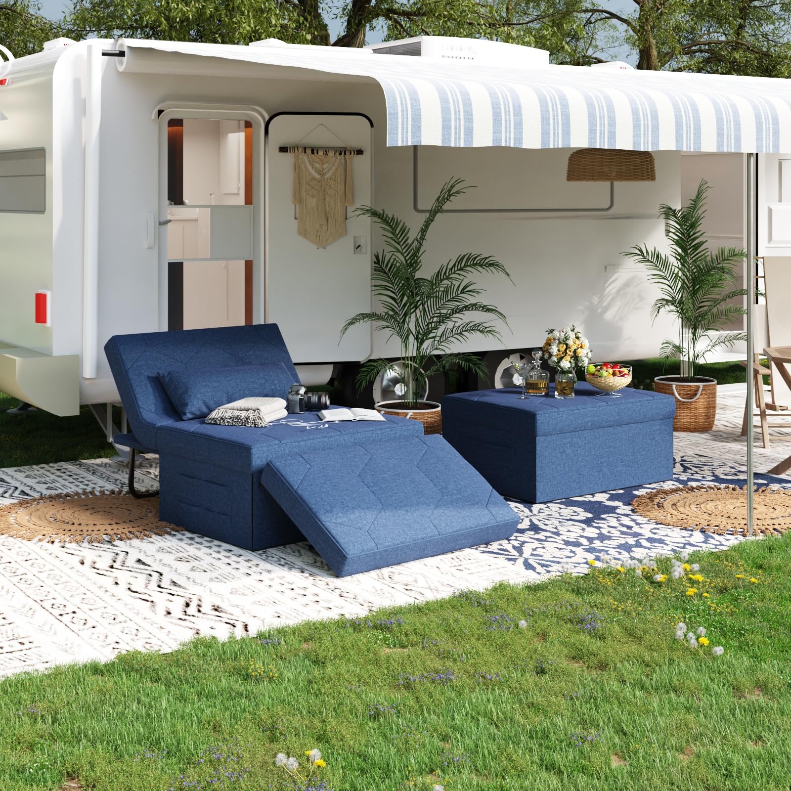 - Versatility and Portability. This chair that turns into a bed shrinks to a 27 inch wide ottoman form, suit for small spaces, and ideal for RV, travel trailers, living room, bedroom, apartment, balcony, and office furniture