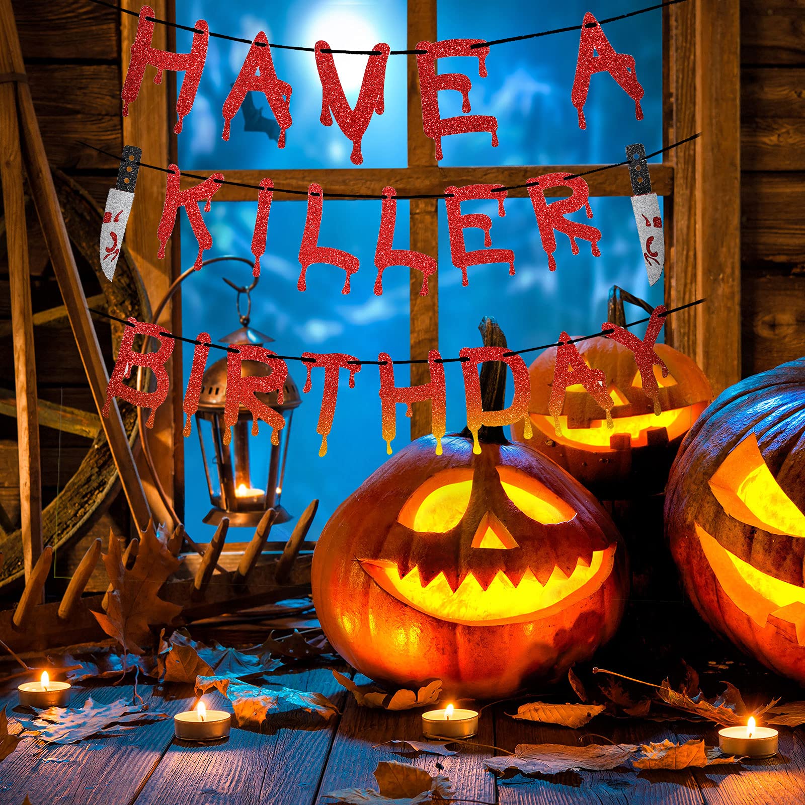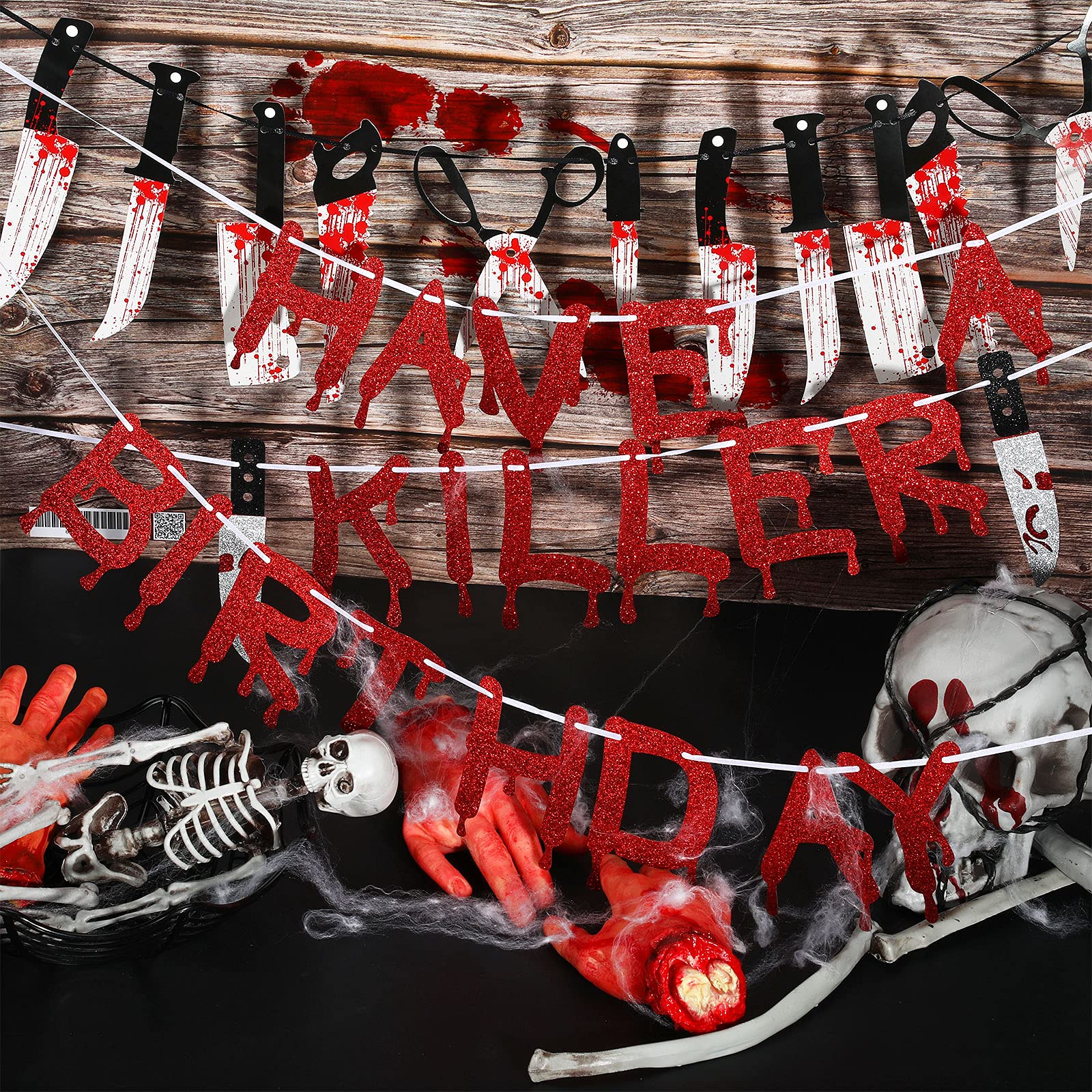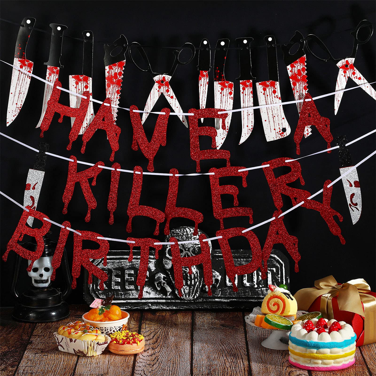 - Horror design: our Halloween knife hanging banner and have a killer birthday banner all feature horror elements, equipped with red lettering and other details, giving them a creepy feel that is very much in keeping with the Halloween spirit