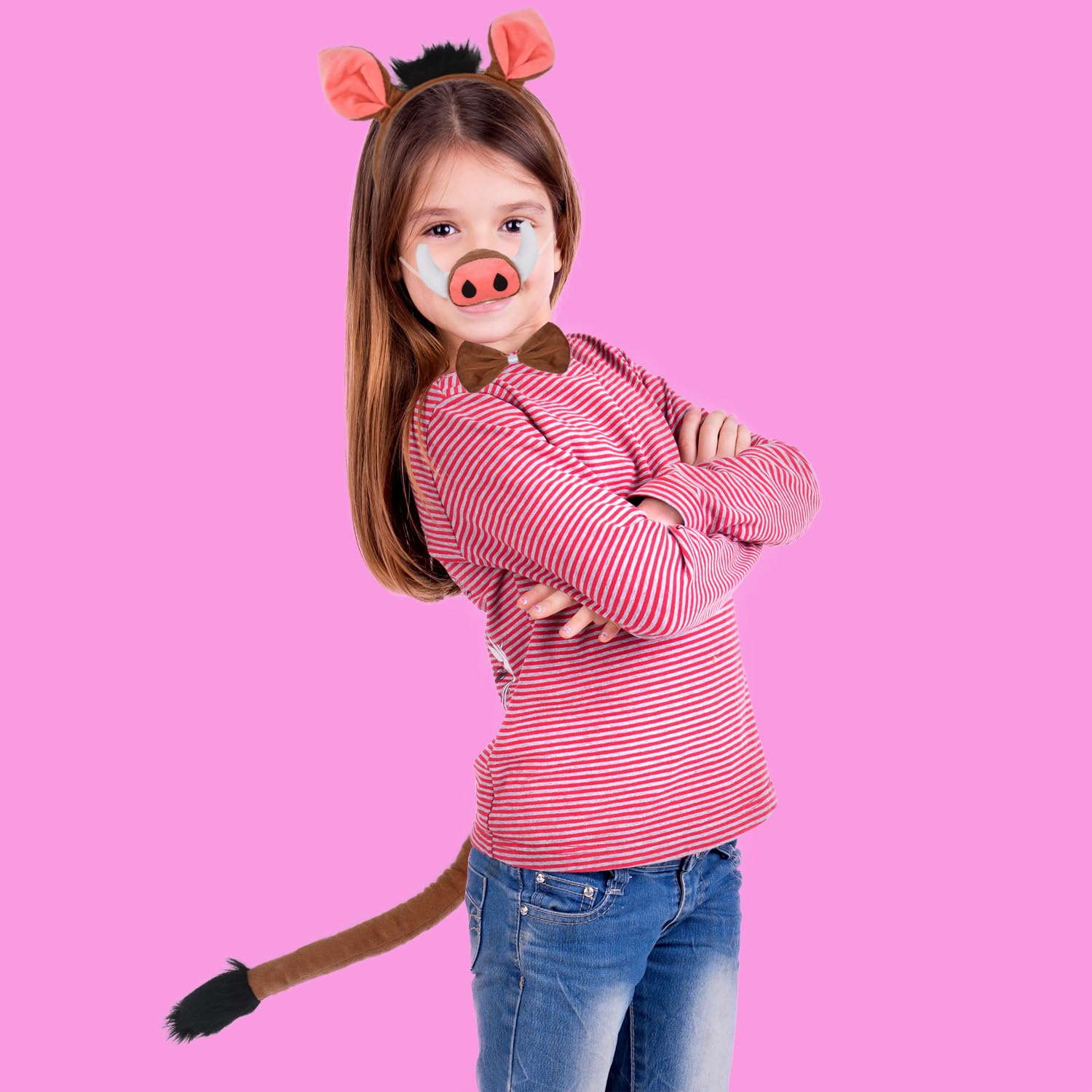 4 Pieces Warthog Ears and Tail Set - Wild Boar Headband with Nose Tail Bow Tie Cosplay Party Halloween Costume Accessories for Kids and Adults