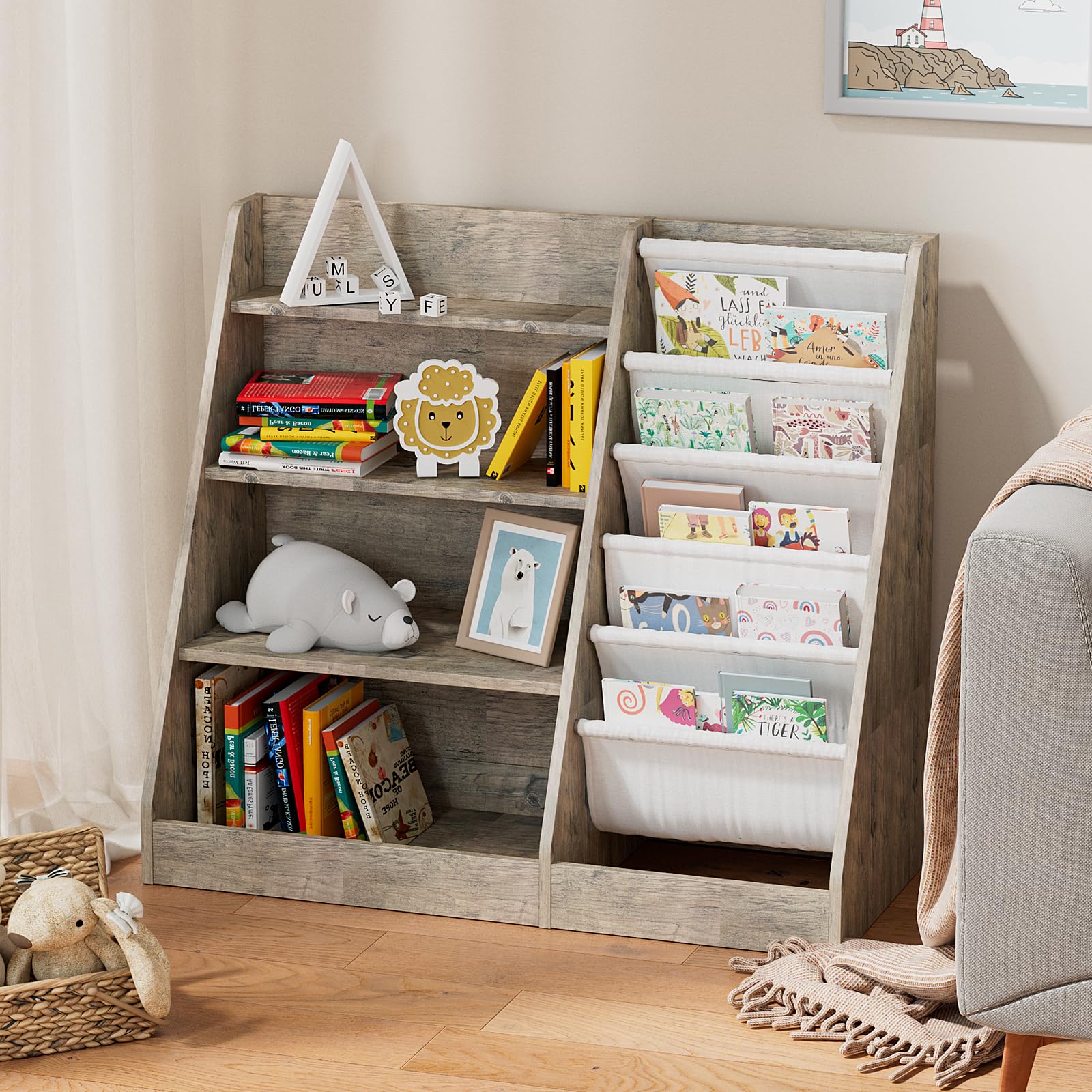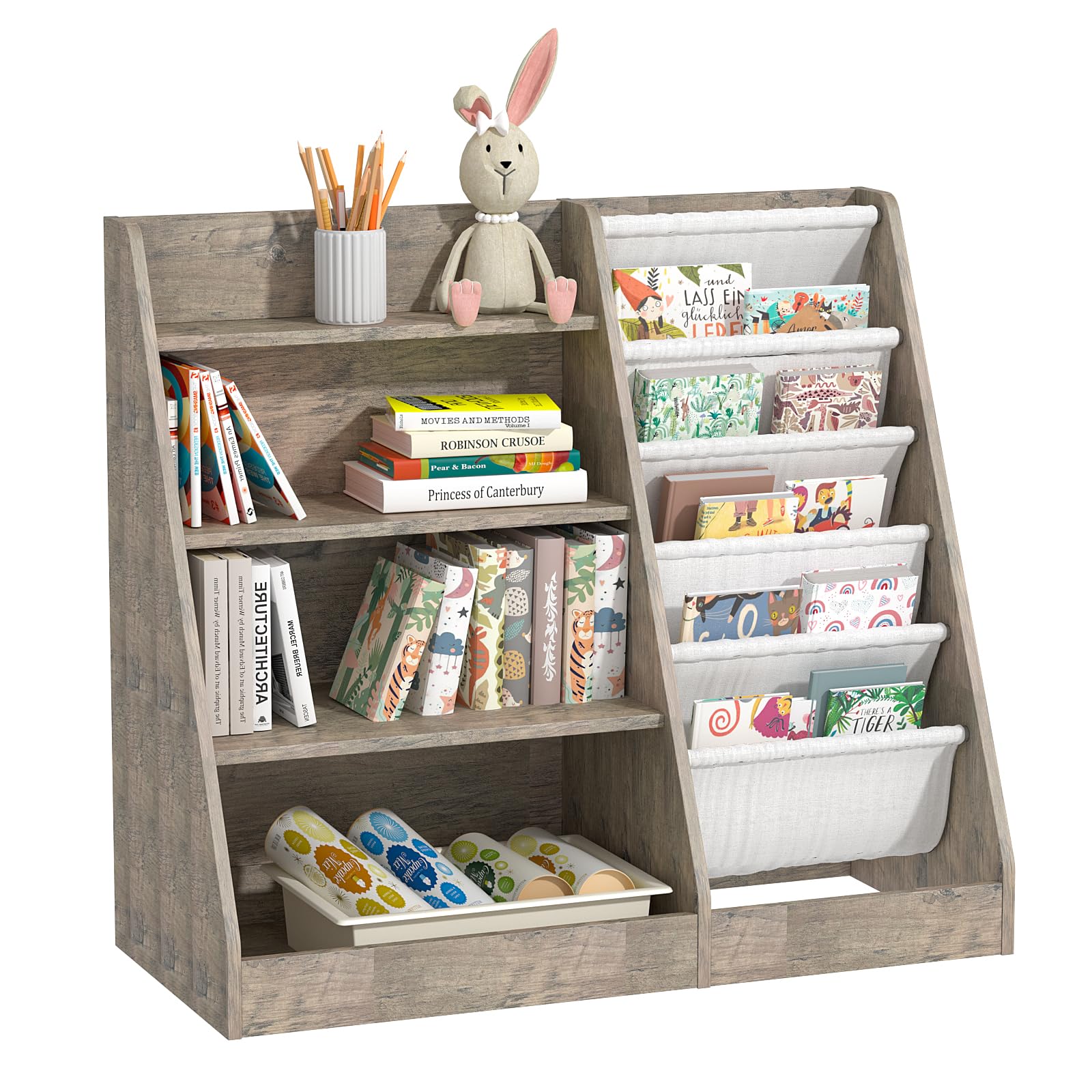 - Five Deep Cotton Linen Storage Sling Pockets: This space-saving kids book rack with storage sling pockets display books with covers facing forward for easy identification by little one. This bookcase can store reading books, coloring books, comic books, picture books... This 4tier wood toddler bookcase can store children’s favorite books, notebooks, and toys...It has enough storage space for building blocks, small trucks, plush animals, model cars, dolls, memorabilia, art supplies etc...