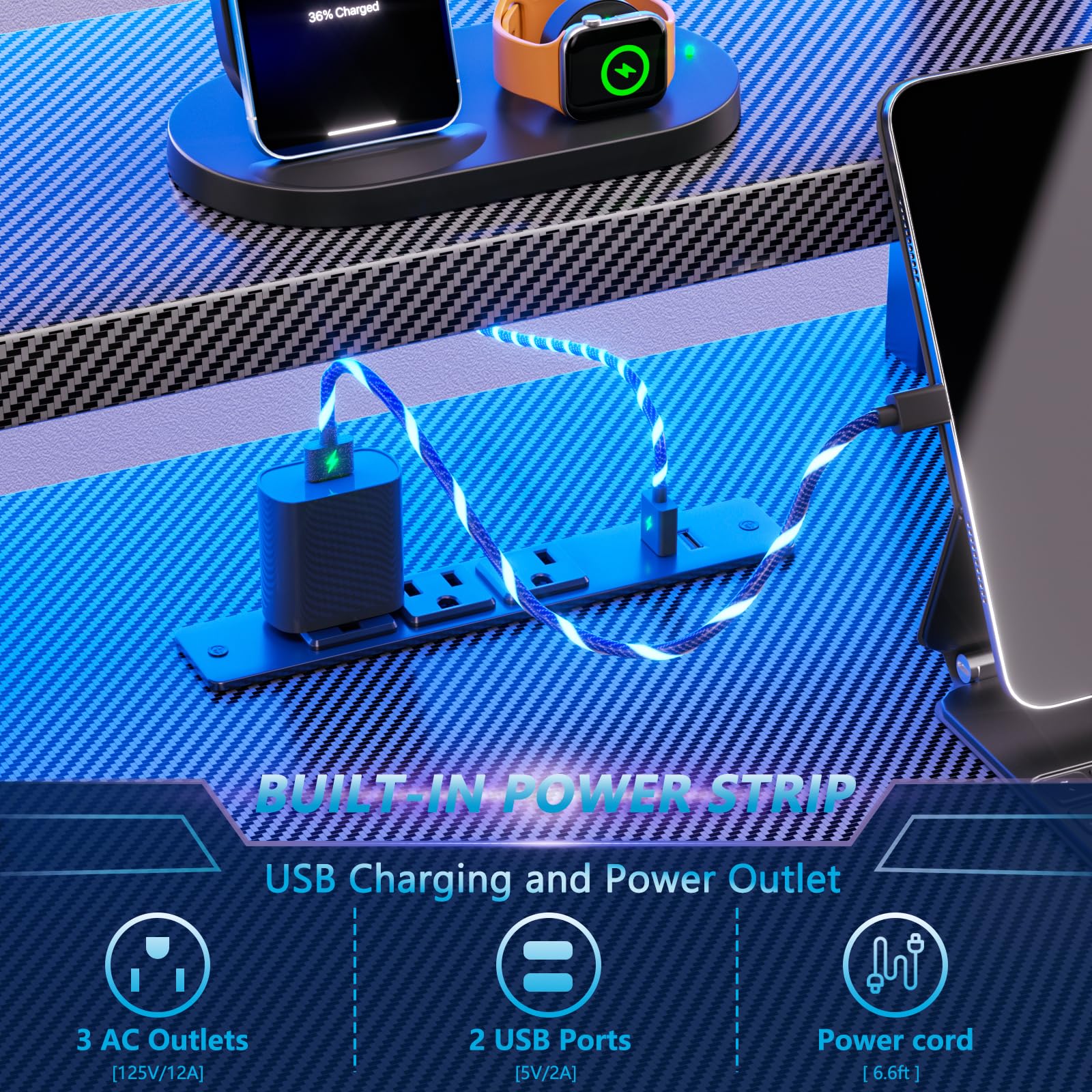 - Gaming Desk with Power Outlets: Korfile l-shaped game table comes with 3 AC power outlets and 2 USB charging ports conveniently located underneath the display stand. Charge devices such as mobile phones and laptops simultaneously without interruption during gaming or work. The gaming desk comes with RGB LED light with a remote control or APP for remote operation