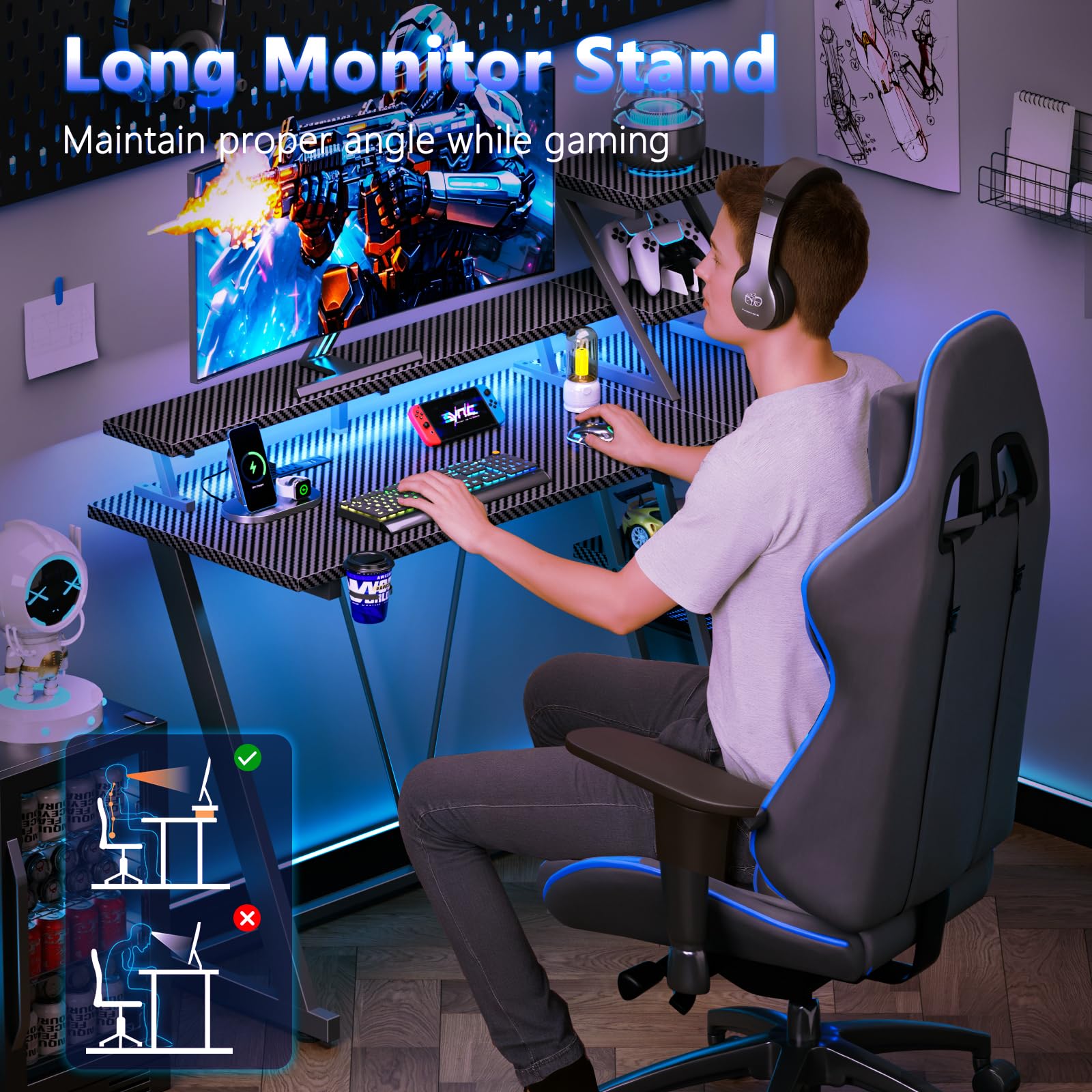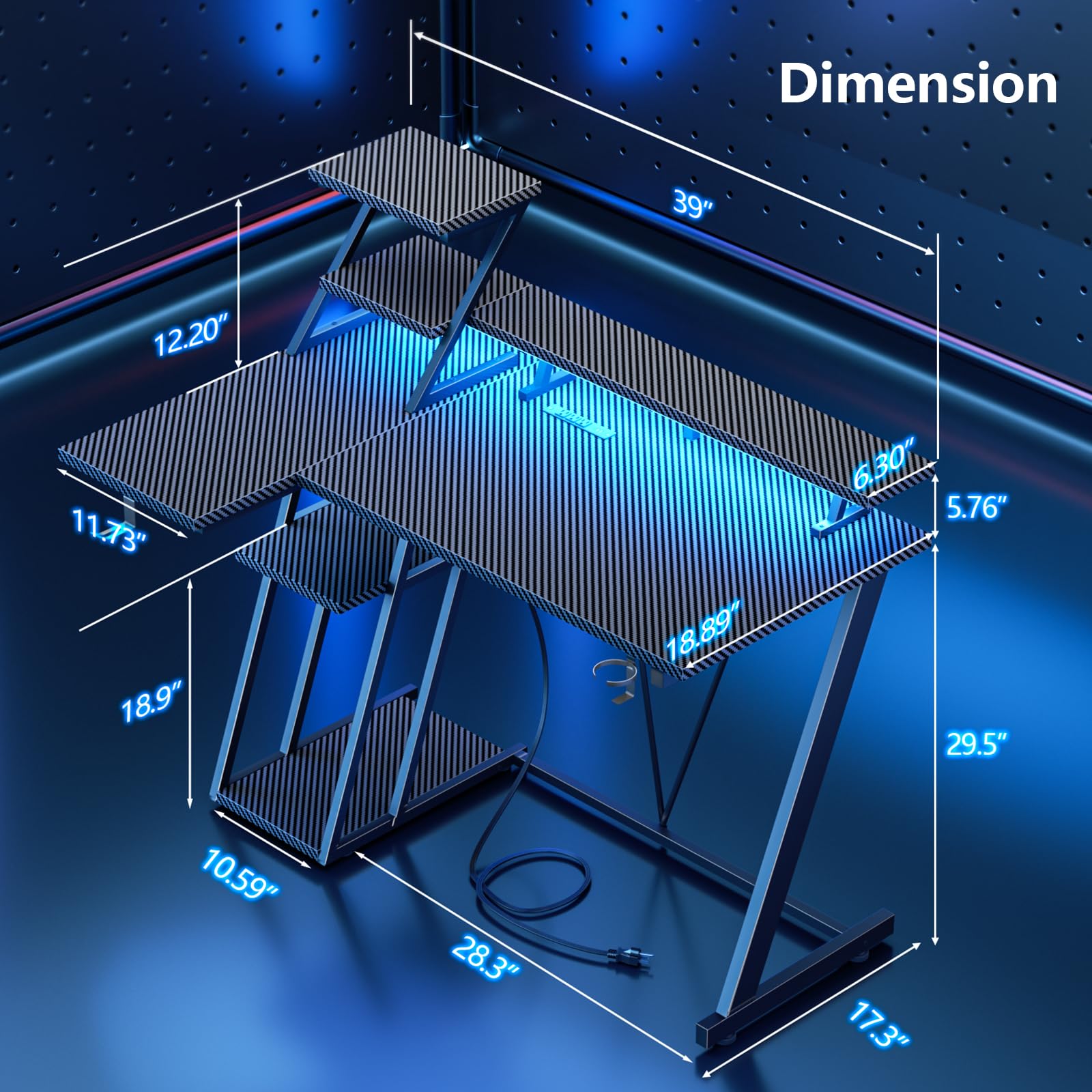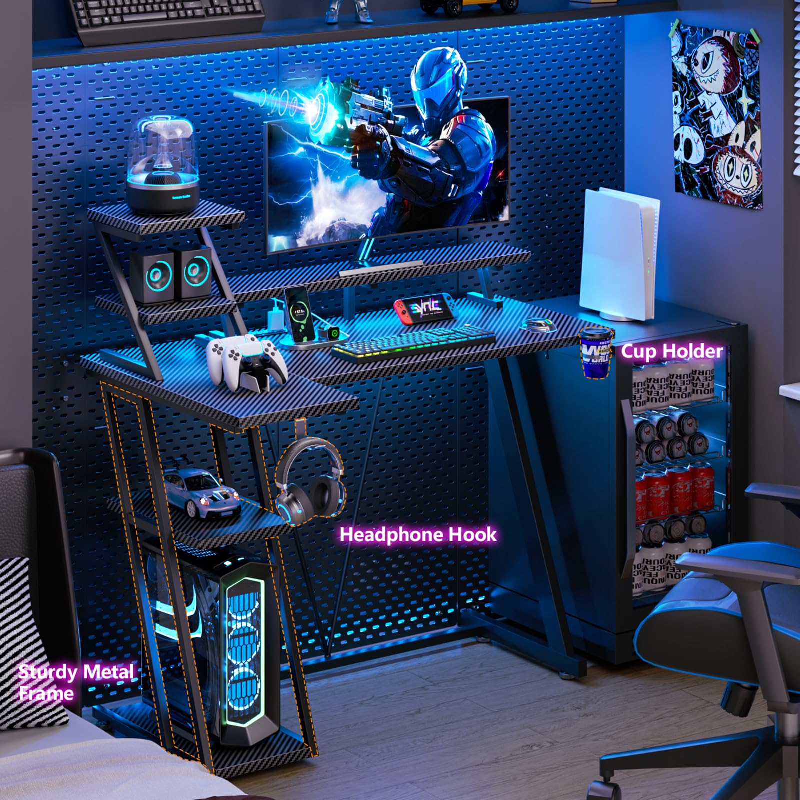 40 Inch Gaming Desk with LED Lights & Power Outlet, Small Gaming Computer Desk with Storage Shelves, L Shaped Gamer Workstations with Monitor Stand for Bedroom, Carbon Fiber Black