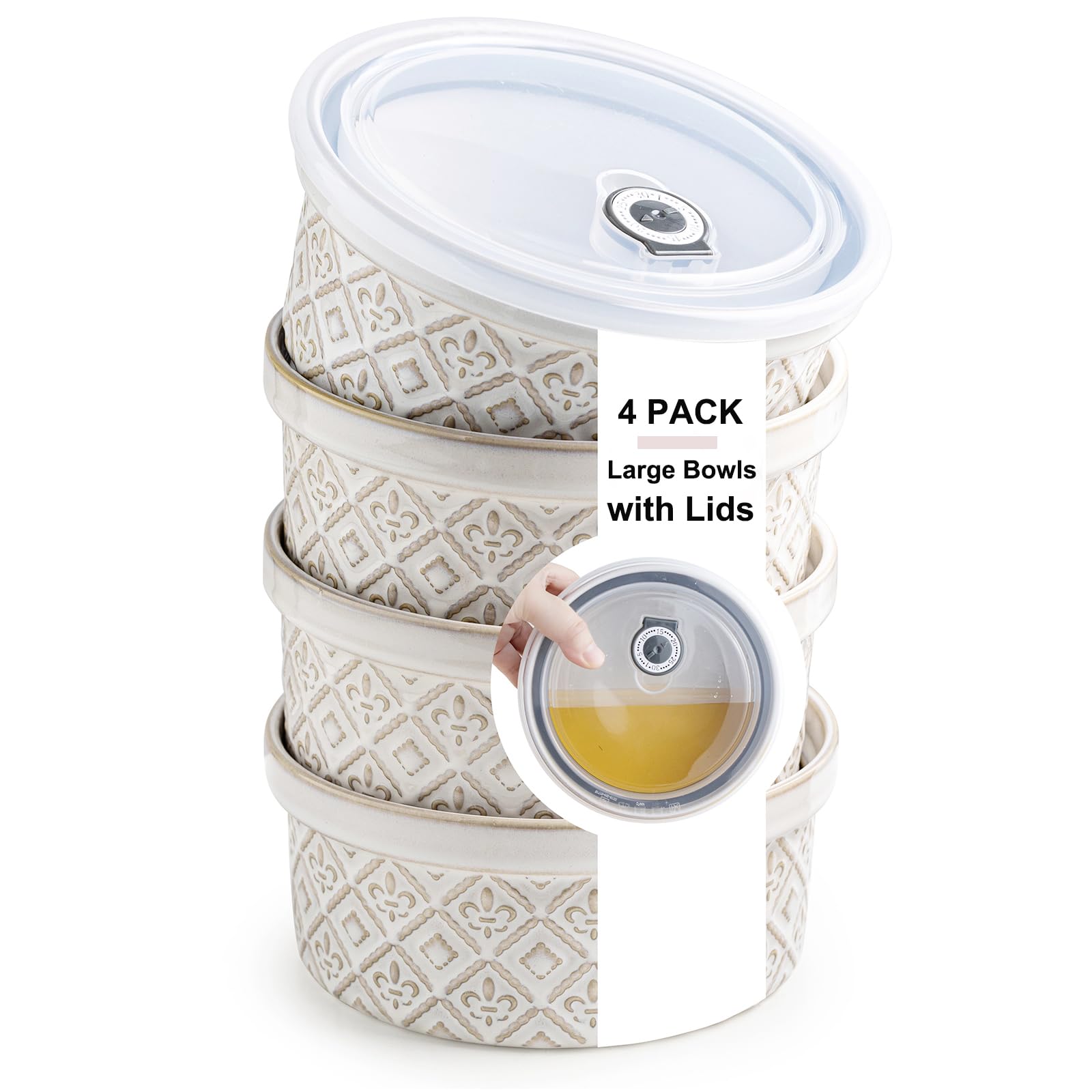 40 Oz Ceramic Airtight Bowls Set of 4 - Large Cereal Bowls with Lids for Salad, Pho, Soup, Pasta, Dessert, Serving, Oatmeal, Nut, Baking Dishes, Dishwasher & Microwave Safe, Beige
