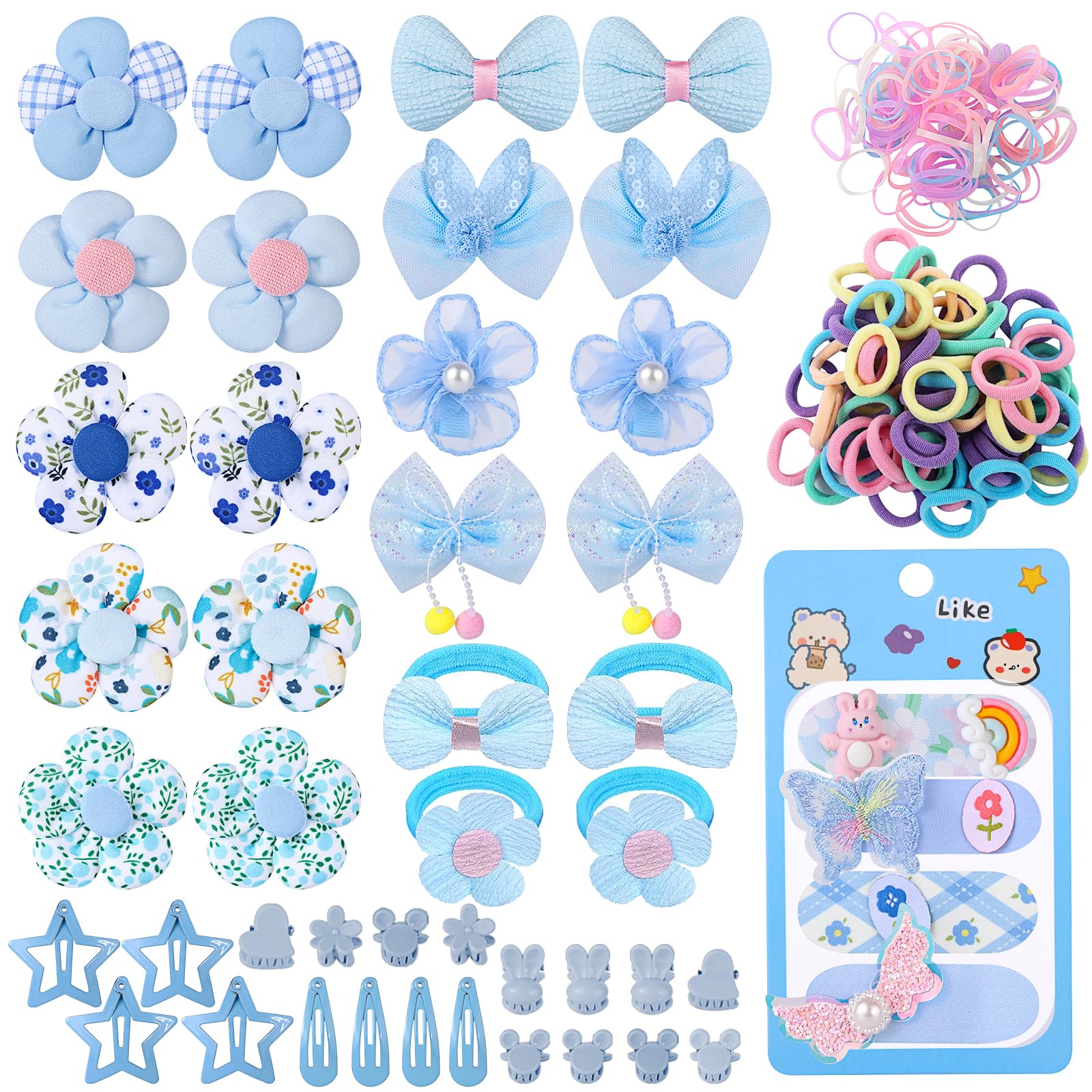 400 Pcs Baby Girls Hair Accessories Set,Baby Girls Hair Ties,Flower Bows Rubber Bands,Hair-friendly Hair Clip,Soft Elastic Hair Bands,Claw Clip(Blue)