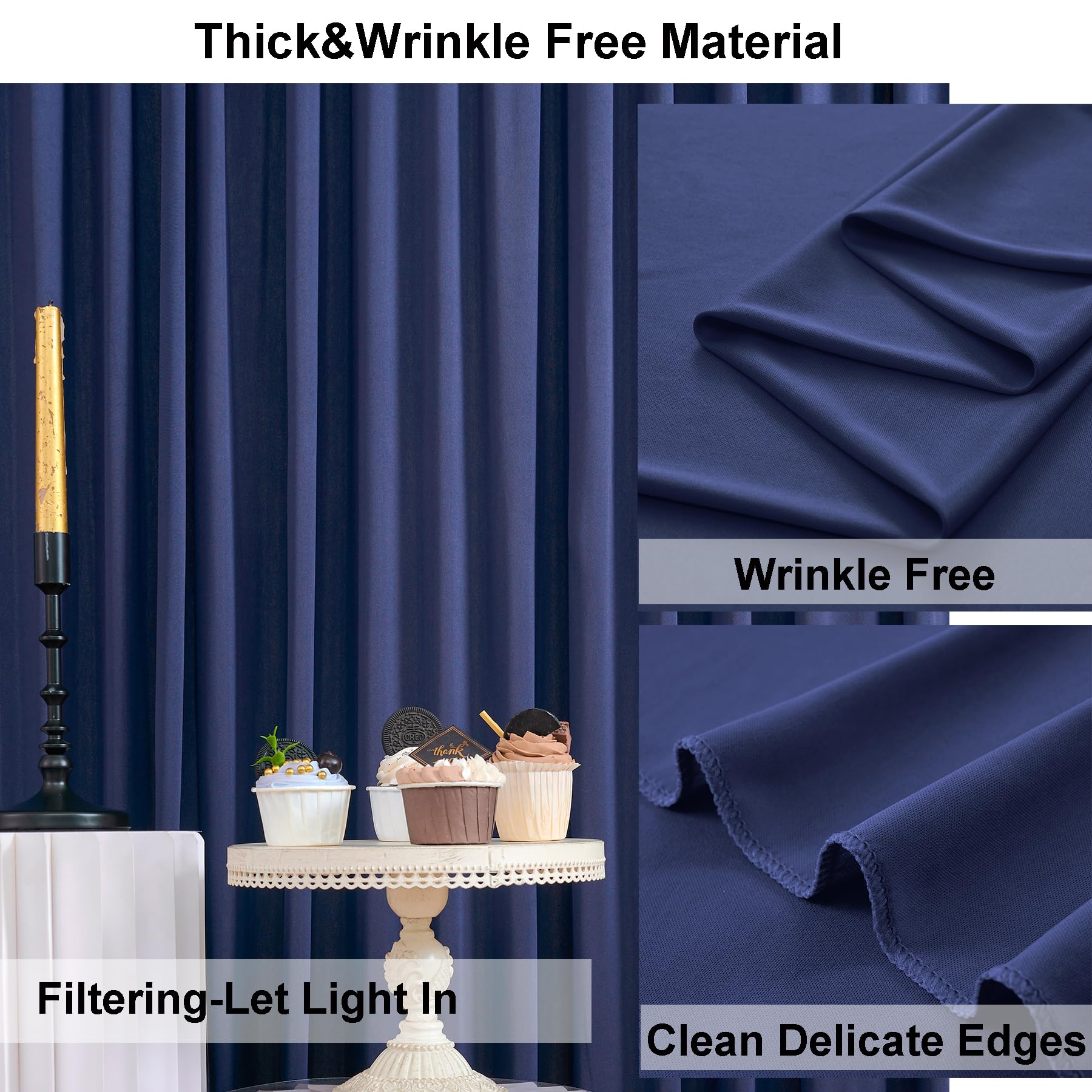 - Wrinkle Free Navy Blue Backdrop Curtains for Parties - High-end 100% polyester fabric with softener make the backdrop very soft, touch well and wrinkles free, more durable. The backdrop will let the light out, not completely opaque, but compared with chiffon or sheer backdrop curtain, it is very thick.