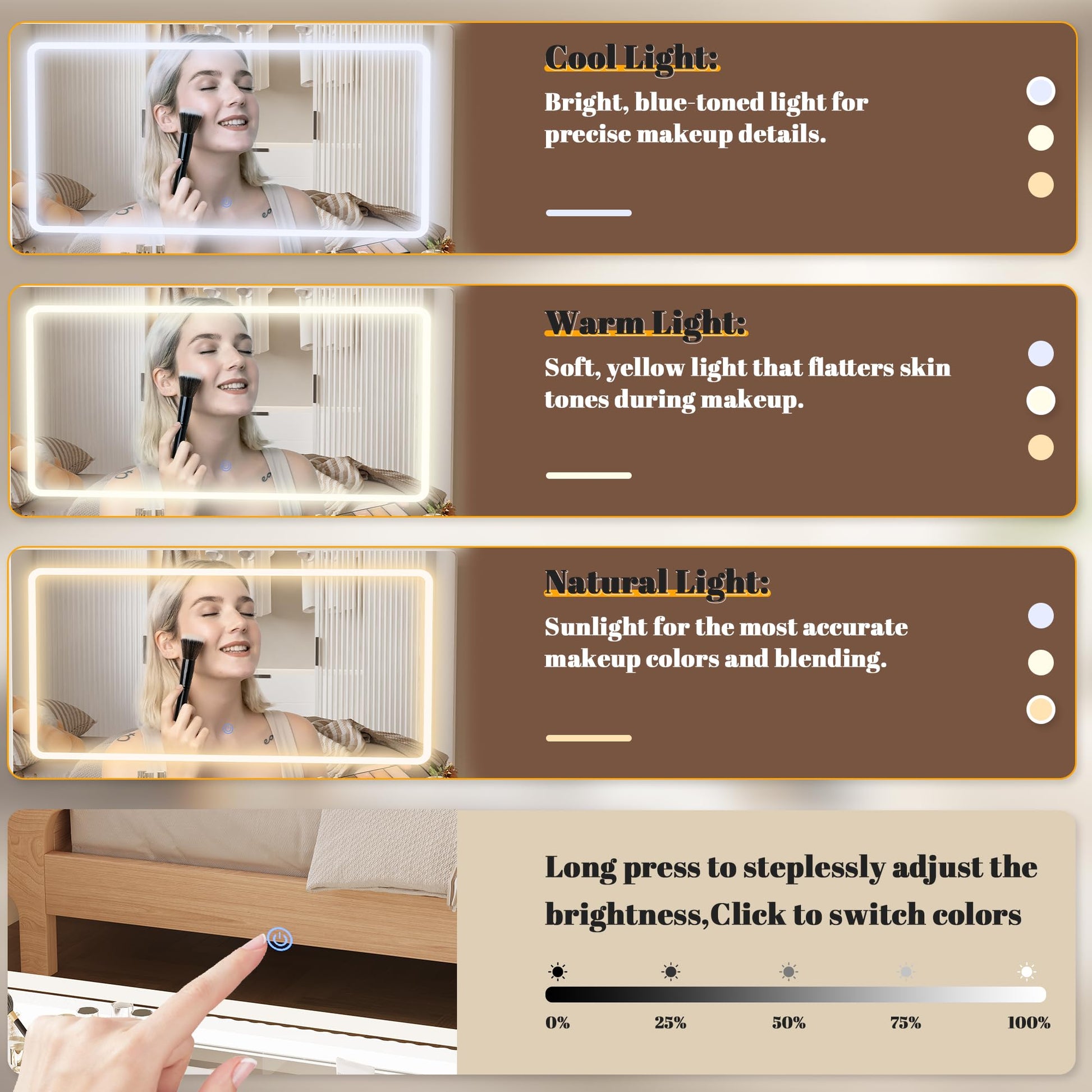 - 【Vanity Set with Large Mirror and LED Lights】This makeup vanity desk with lights features a large mirror with 10 Hollywood-style LED bulbs. Choose from 3 color modes (warm yellow, warm white, and cool white) and adjust the brightness settings to create the perfect lighting for your makeup needs. Ideal for home, work, hair salons, and studio makeup applications.