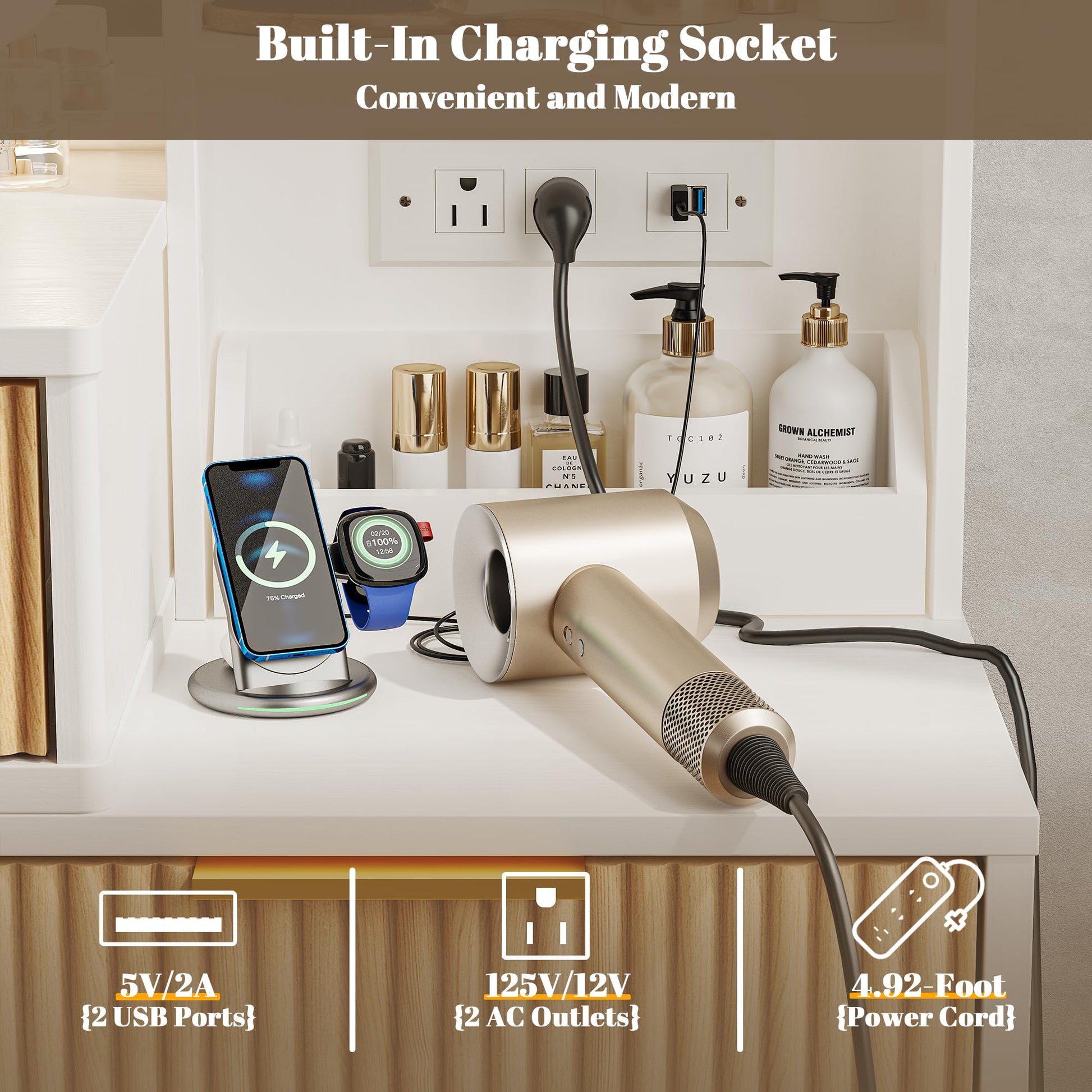 - 【32" HD Illuminated Mirror Makeup Application】Vanity desk with mirror and lights features 32" high-definition illuminated mirror, which guarantees perfect lighting for flawless makeup application. With customizable brightness levels and three lighting modes, it lets you create the ideal atmosphere for your beauty routine, whether it's for a daytime glow or an evening allure.