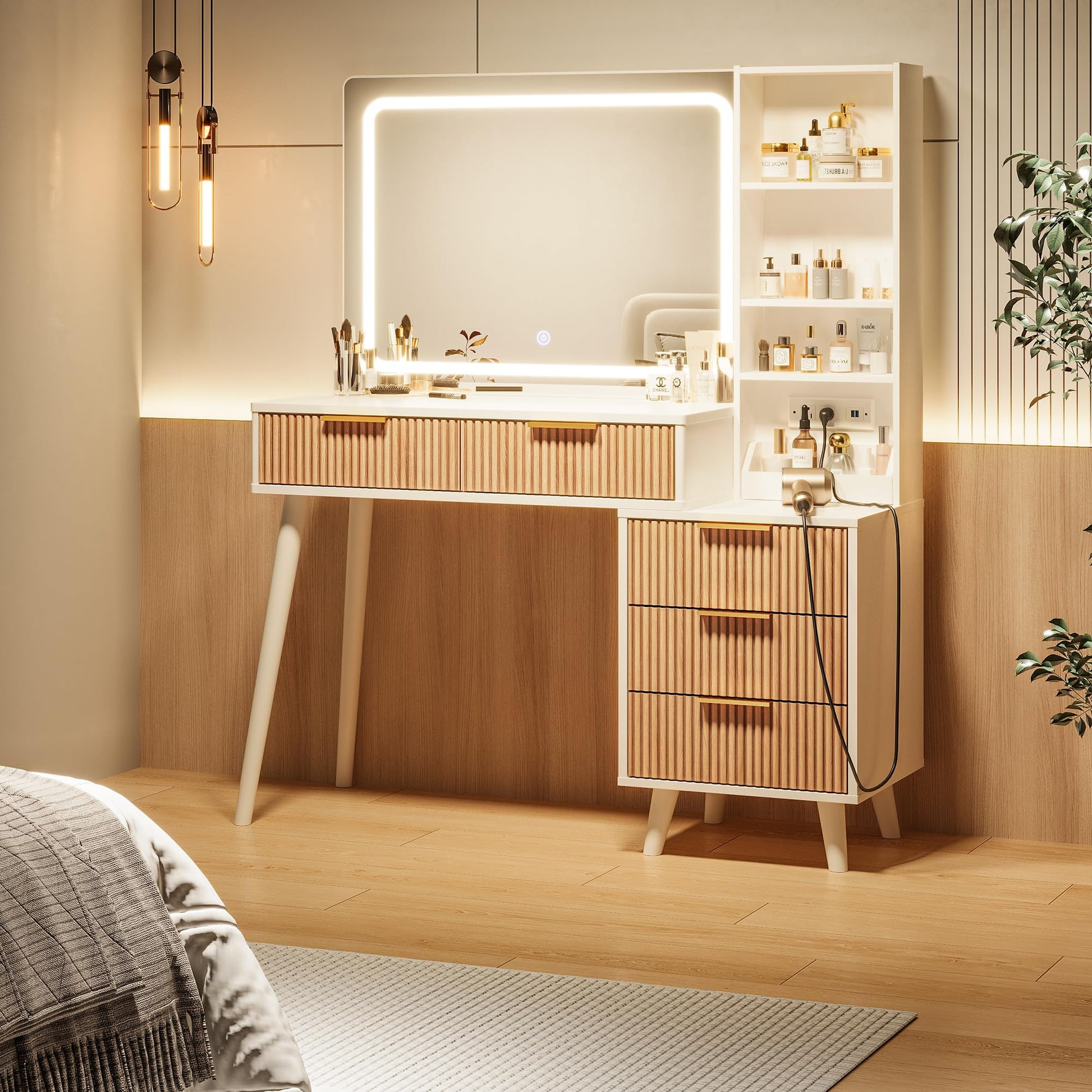 44" Vanity Desk with Mirror and Lights, Makeup Vanity Desk with Power Outlet, Makeup Desk with 5 Drawers&Storage Shelves, Vanity Table 3 Color Adjustable Brightness Dressing Table Set for Bedroom