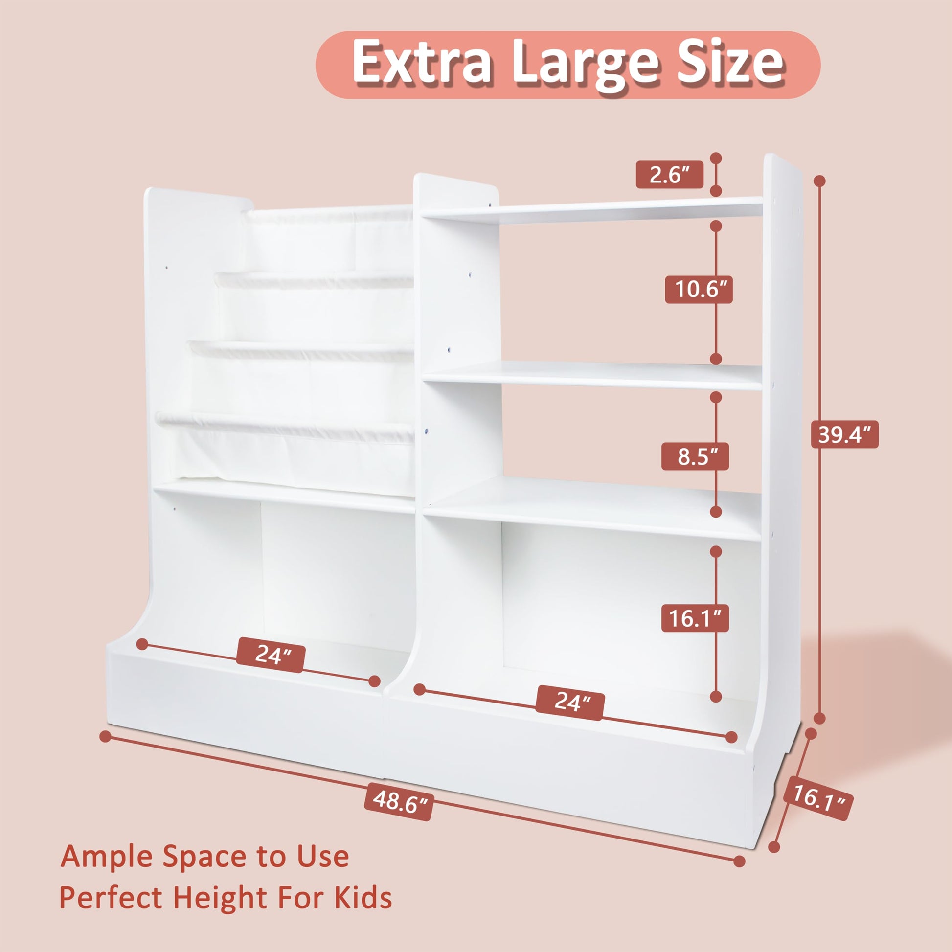 - 【MULTIFUNCTIONAL KIDS BOOK SHELF】This 48.6"W x 16.1"D x 39.4"H baby bookshelf features 3 tiers of sling pockets, 3 tiers of display shelves, and 2 large-size toy storage cabinets. A good 3-in-1 option helps your little one store gifts, organize toys, and display books with covers facing forward for easy identification.