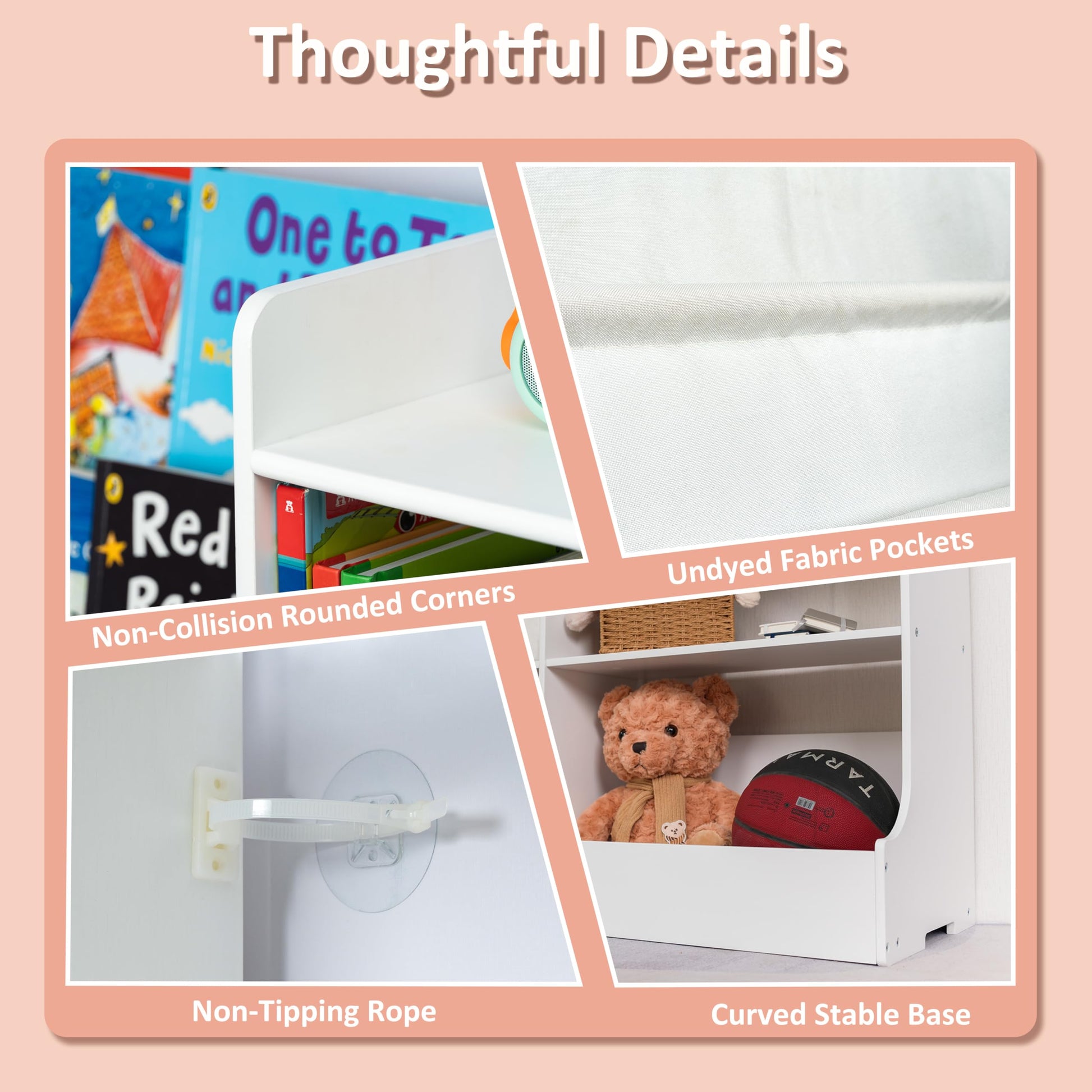 - 【CPSC & CPSIA CERTIFICATION】The wood kids bookcase with suitable height is easy for kids to reach. Rounded corners and undyed fabric pockets improve product reliability while keeping your children safe. We also provide non-tipping rope to avoid any possible accidents. Our kid's bookshelf enjoys the CPSC and CPSIA certification issued by the federal government. Ensure that every detail is qualified and safe to use for children and families.
