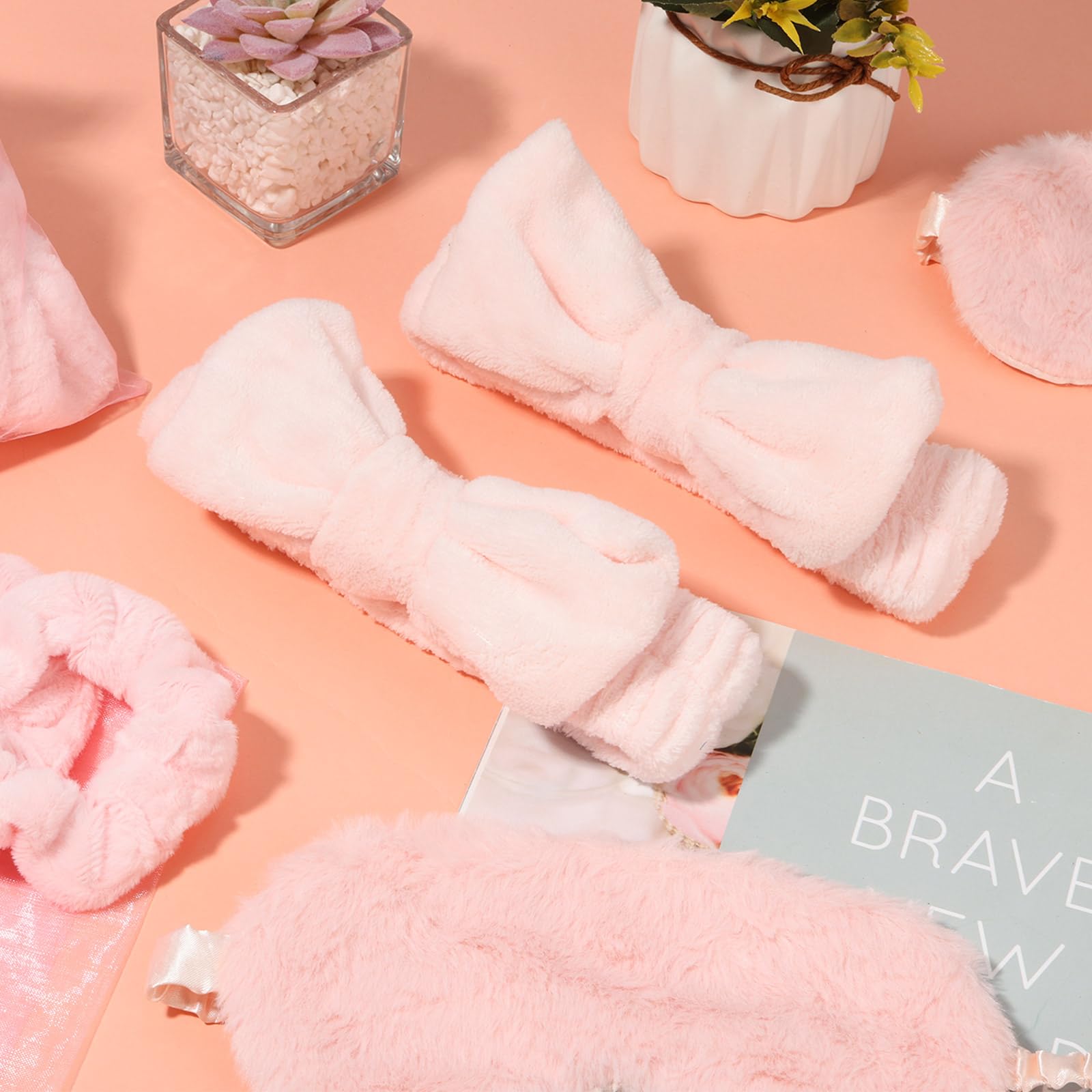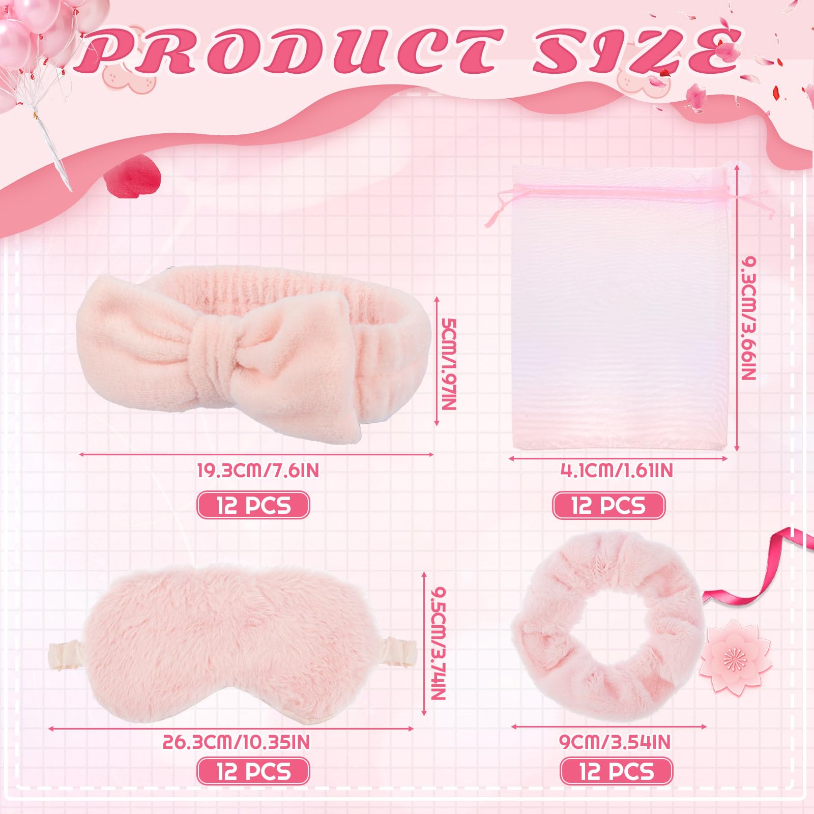 - Complete Spa Sleepover Party Supplies: This sleepover party supplies set includes 48 premium accessories: 12 plush eye masks, 12 pink velvet scrunchies, 12 pink spa headbands, and 12 organza bags. This spa party favor set is perfect for pampering your friends and making everyone feel special on spa day.