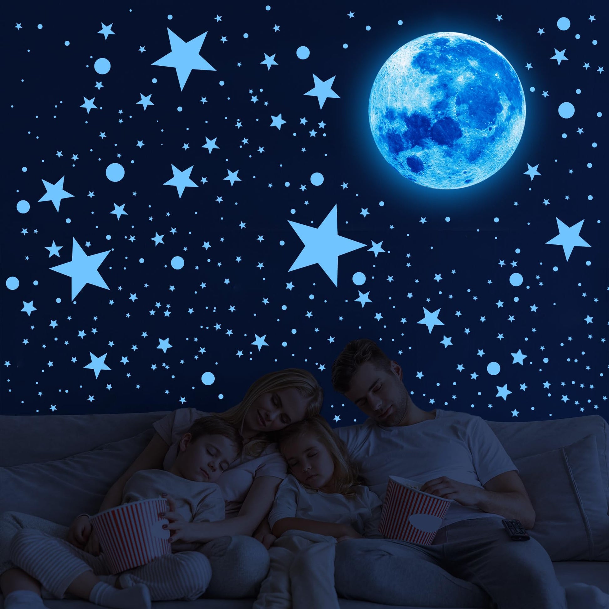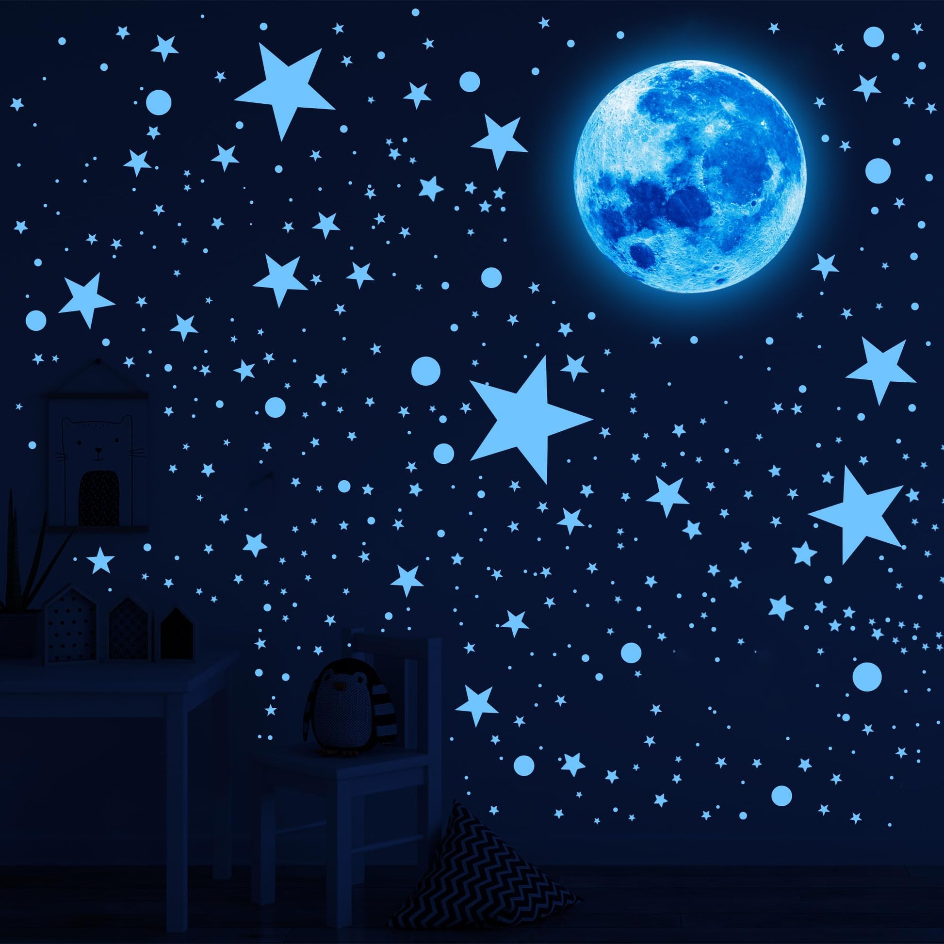 - Classic Moon and Stars;Create Magic Starry Sky: Our glow stars and moon wall decals come with stars;dots and moon pattern;including 492pcs stickers in total.These luminous stars are invisible colors during the day, and they will magically glow blue brightly in the night darkess.With the glowing galaxy set,you will create a fantastic and romantic starry sky in the night