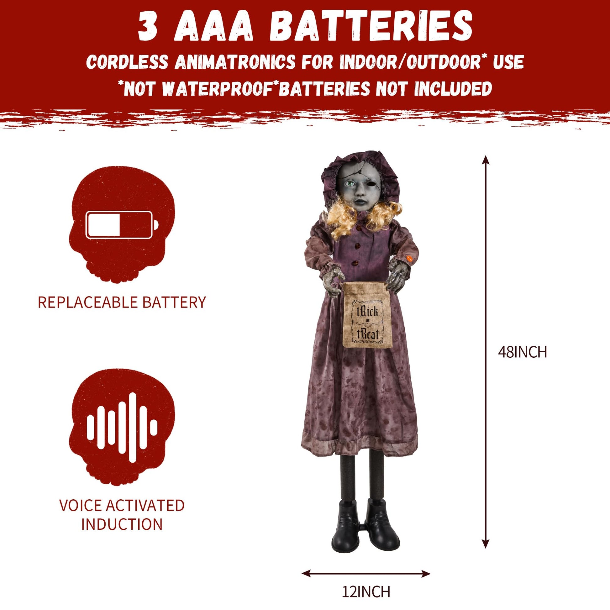 - Perfect Halloween Decorations for Outdoor and Indoor Displays: Our Halloween decorations are ideal for Halloween parties, theme parties, carnivals, festivals, and special occasions. Create a spine-chilling experience for your visitors with our 4ft scary doll animatronics, perfect for both indoor and Halloween decorations outdoor setups.