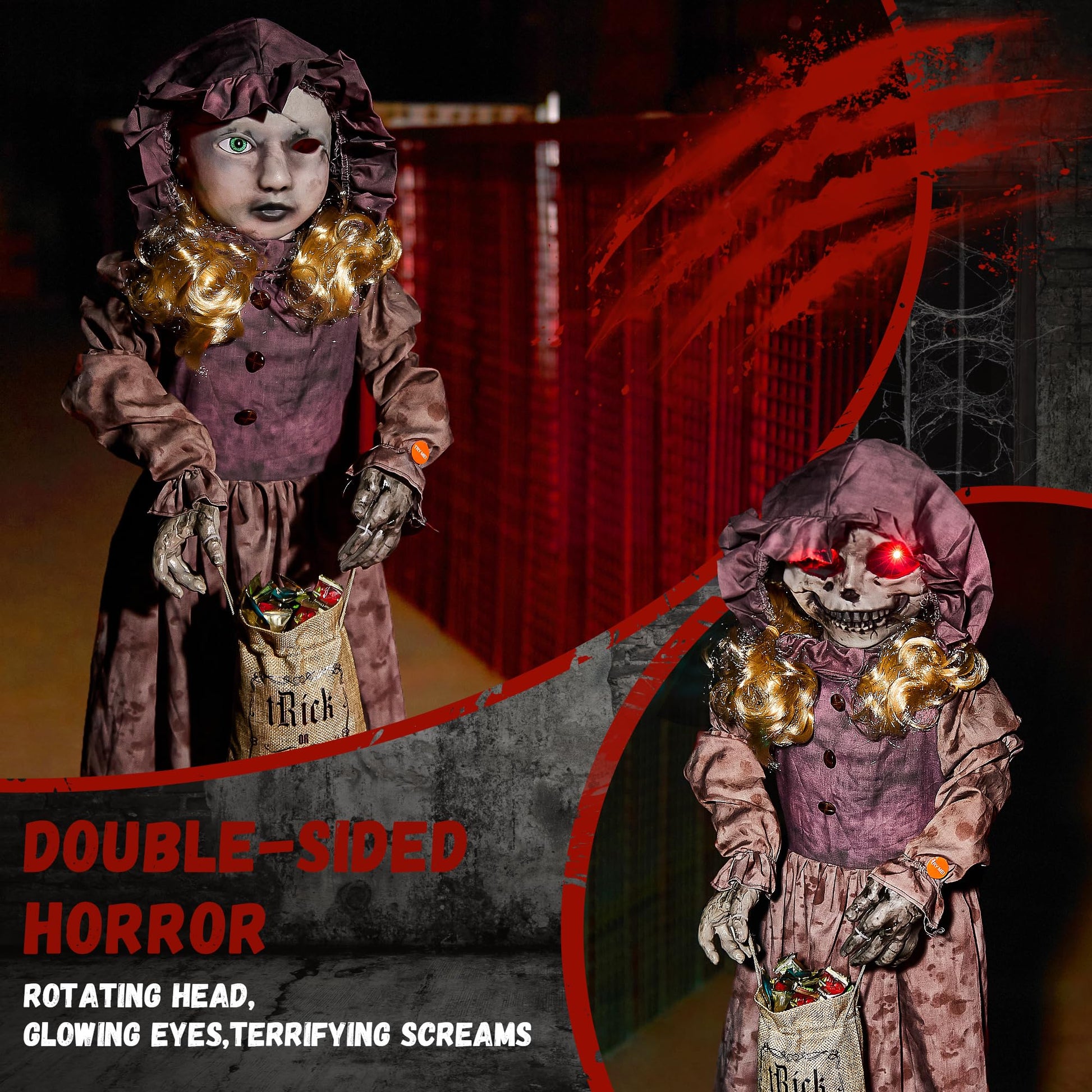 - Terrifying Double-Sided Haunted Doll Design: When activated, this scary Halloween decoration reveals its horrifying surprise—a rotating head that transforms into a skull with glowing eyes and terrifying screams. This creepy doll is the ultimate surprise for your Halloween party, making it an essential part of any Halloween animatronics, haunted doll display, or Halloween props collection.