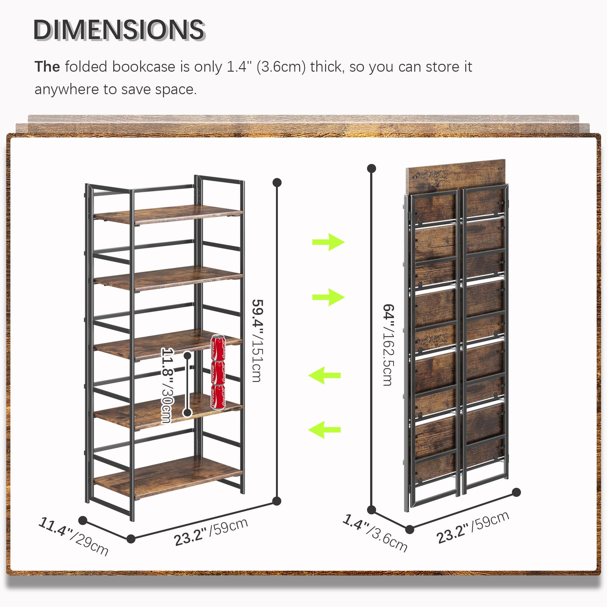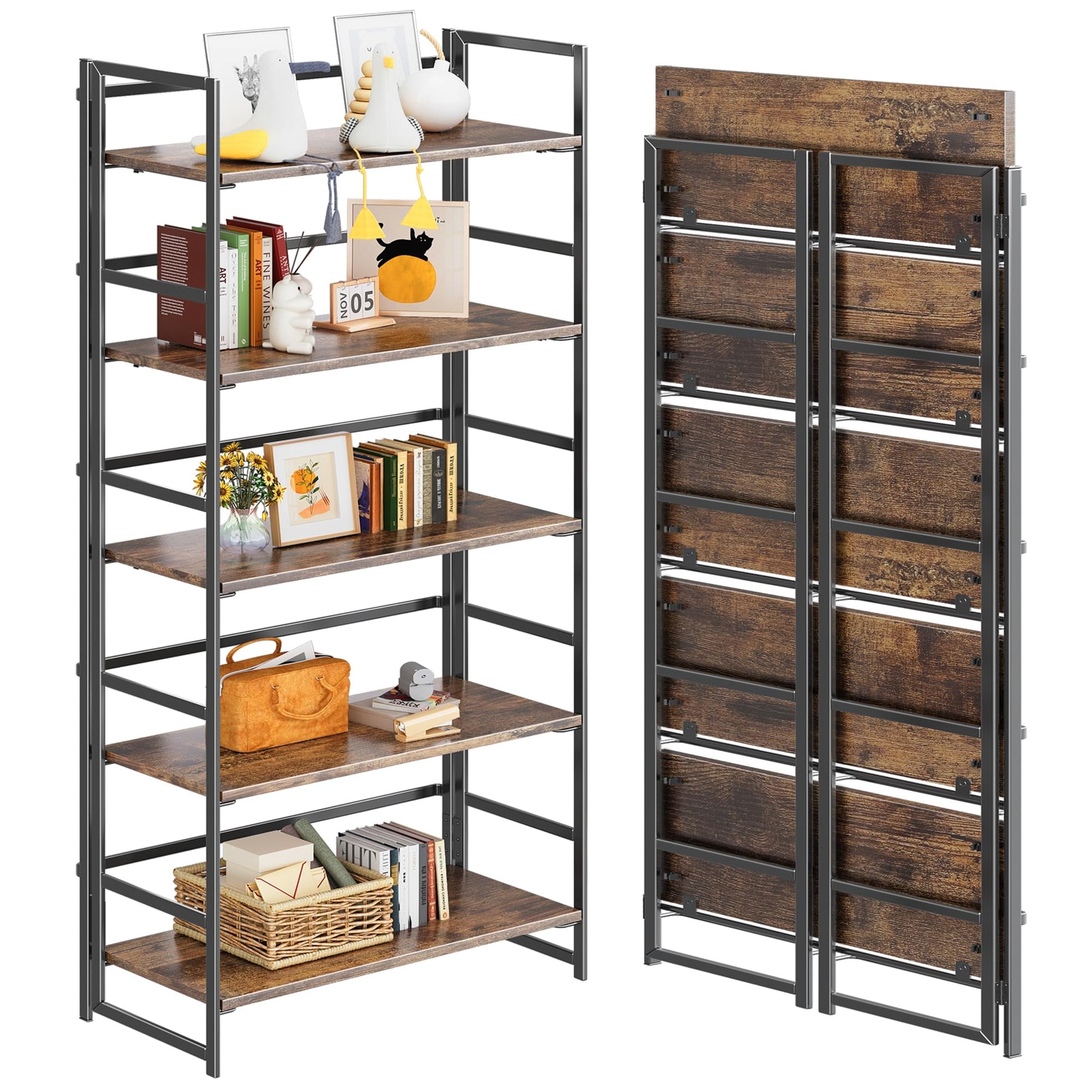 4NM No Assembly 5 Tiers Book Shelves, Black Folding Bookshelf Bookcase Open Industrial Foldable Shelves for Bedroom, Living Room, Home Office - Rustic Brown Black
