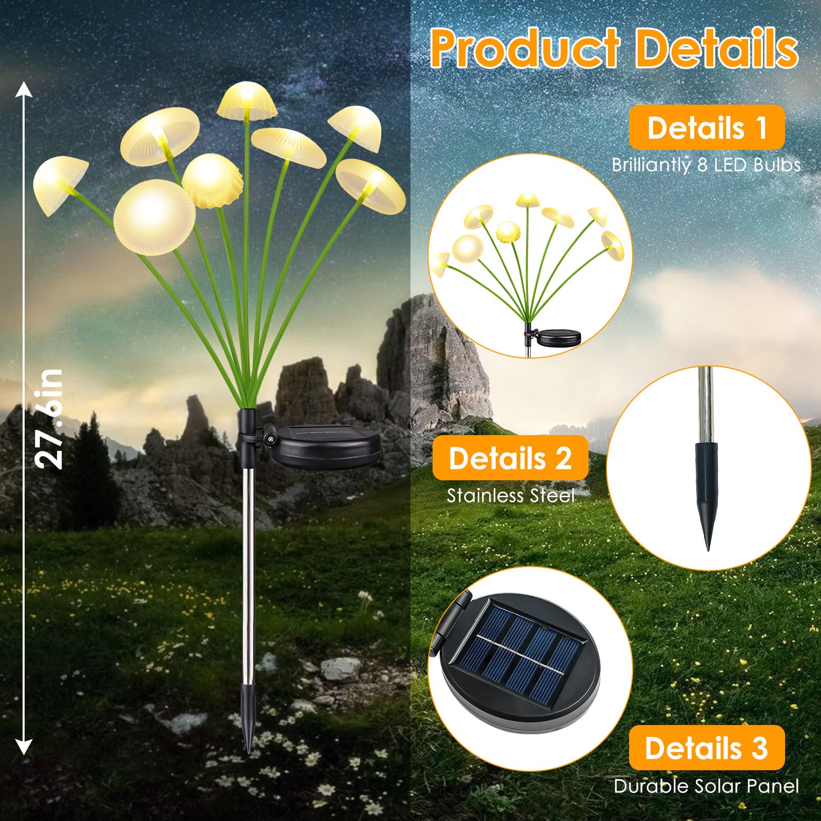 - [Swaying in the Wind Solar Lights Like Fireflies] Our outdoor solar mushroom lights are supported by ultra-soft and flexible wires, allowing them to sway naturally in the breeze, just like a cluster of fireflies fluttering in the dark. Unlike other solar lights with only 6 LEDs, our solar outdoor lights feature 8 larger and brighter premium LED bulbs, providing superior illumination and a more captivating display.